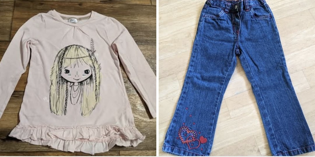 Next ...nabizim hezkou holcici soupravu ( svetle ruzove triko s dlouhym rukavem, rifllove elastaky 3/4 ) ve vybornem, zachovalem stavu. Elastaky jsou nenosene. Velikost 3-4 roky /104cm.