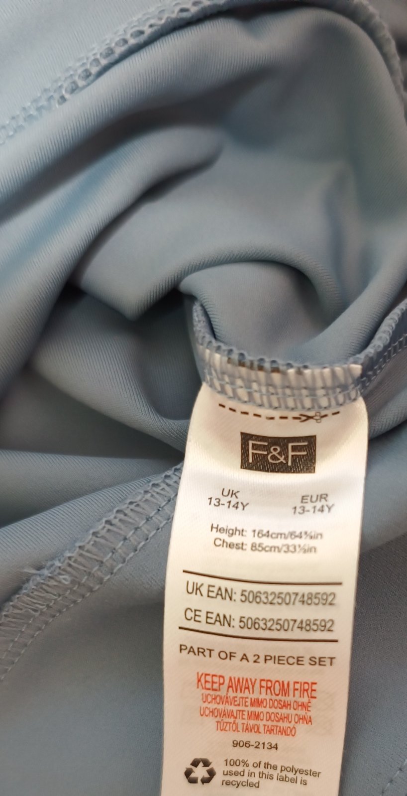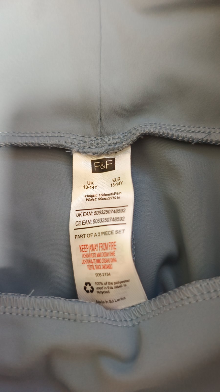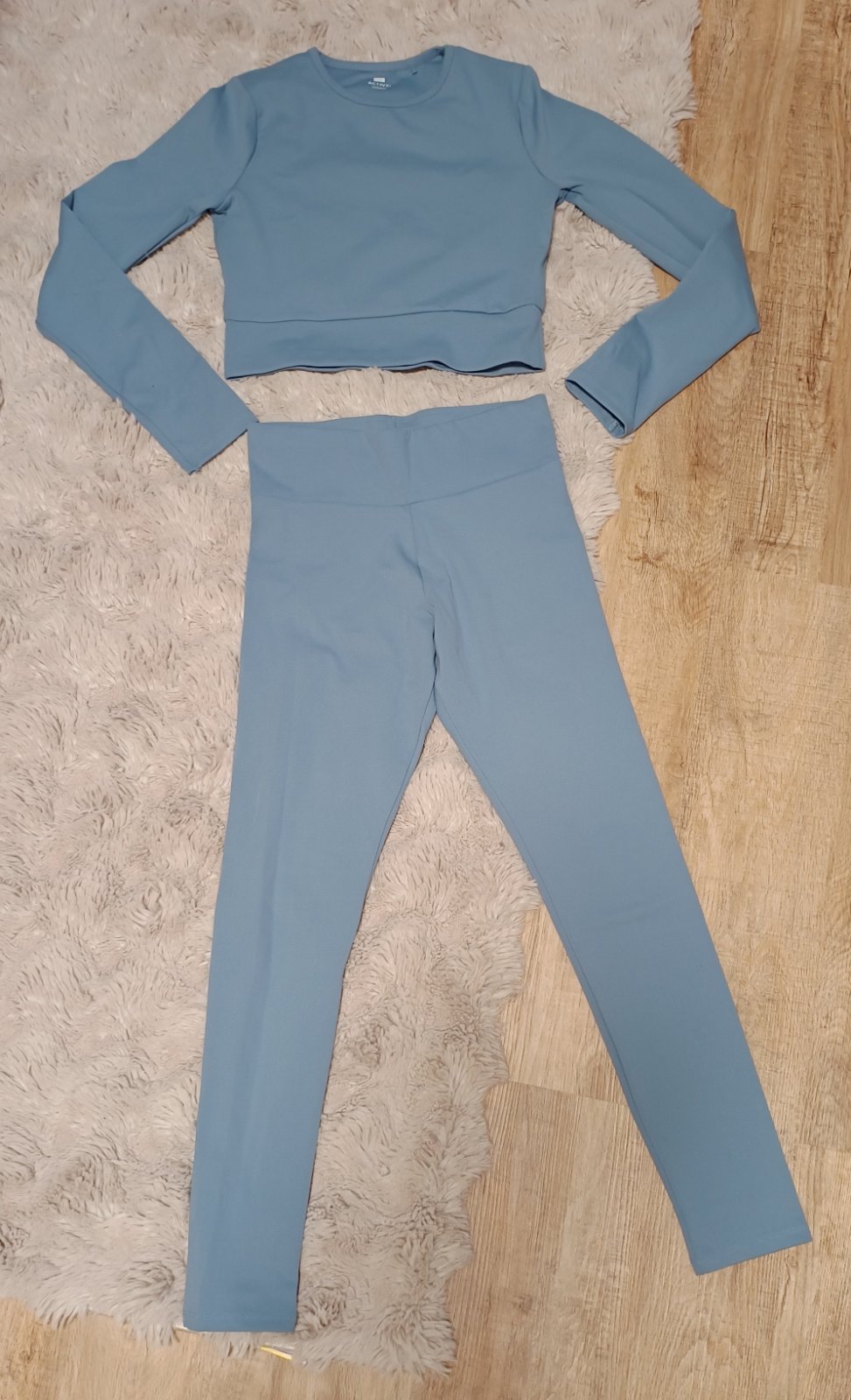 Set je nový, nenošený, jen vypraný. Látka je pevnější. Délka legín 87 cm, vnitřní délka nohavice 67 cm, pas v klidu 33, po natažení až 40 cm. Tričko, délka 37 cm, rukáv od krku 69 cm, šíře 37 cm.