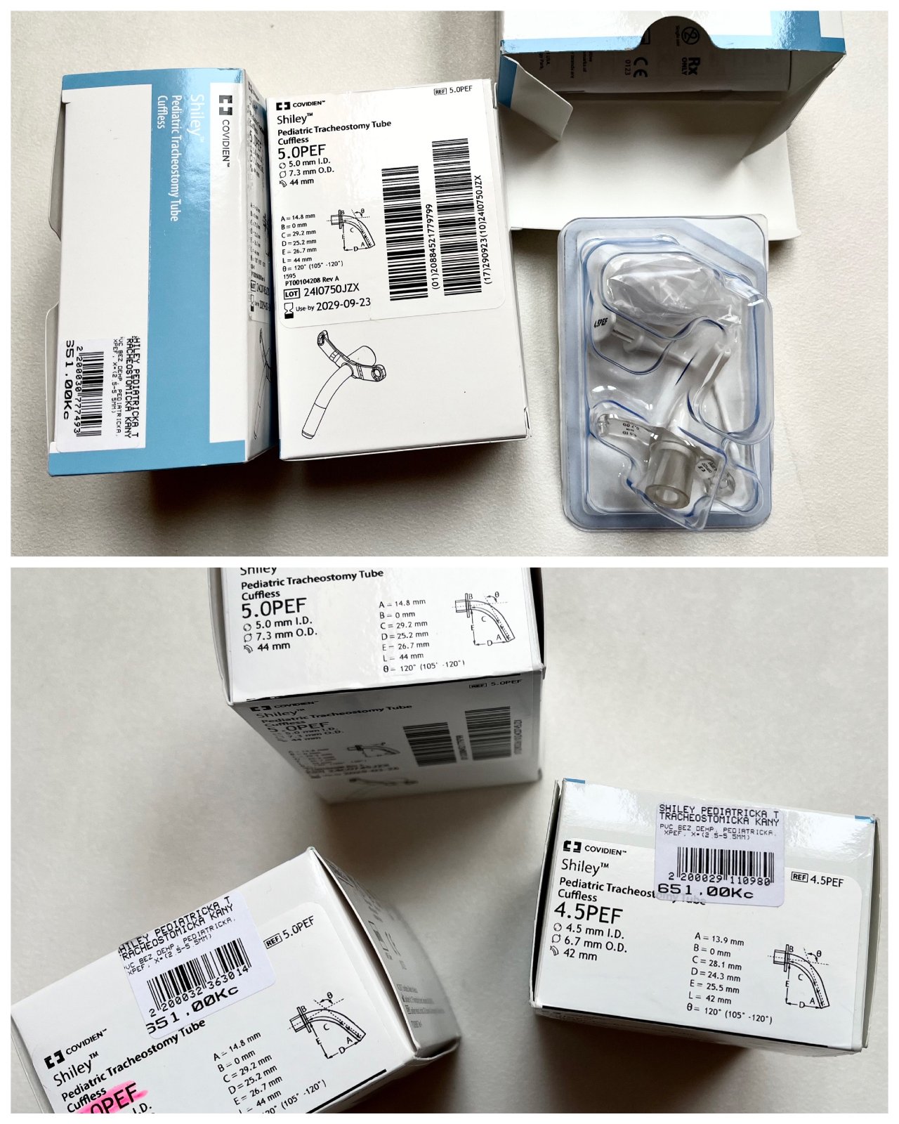 Tracheostomické kanyly 1x vel. 4.5 a 2x vel. 5, sterilní, neotevřené. Cena za jednu kanylu 400,- Kč, případně všechny za 1000,-.