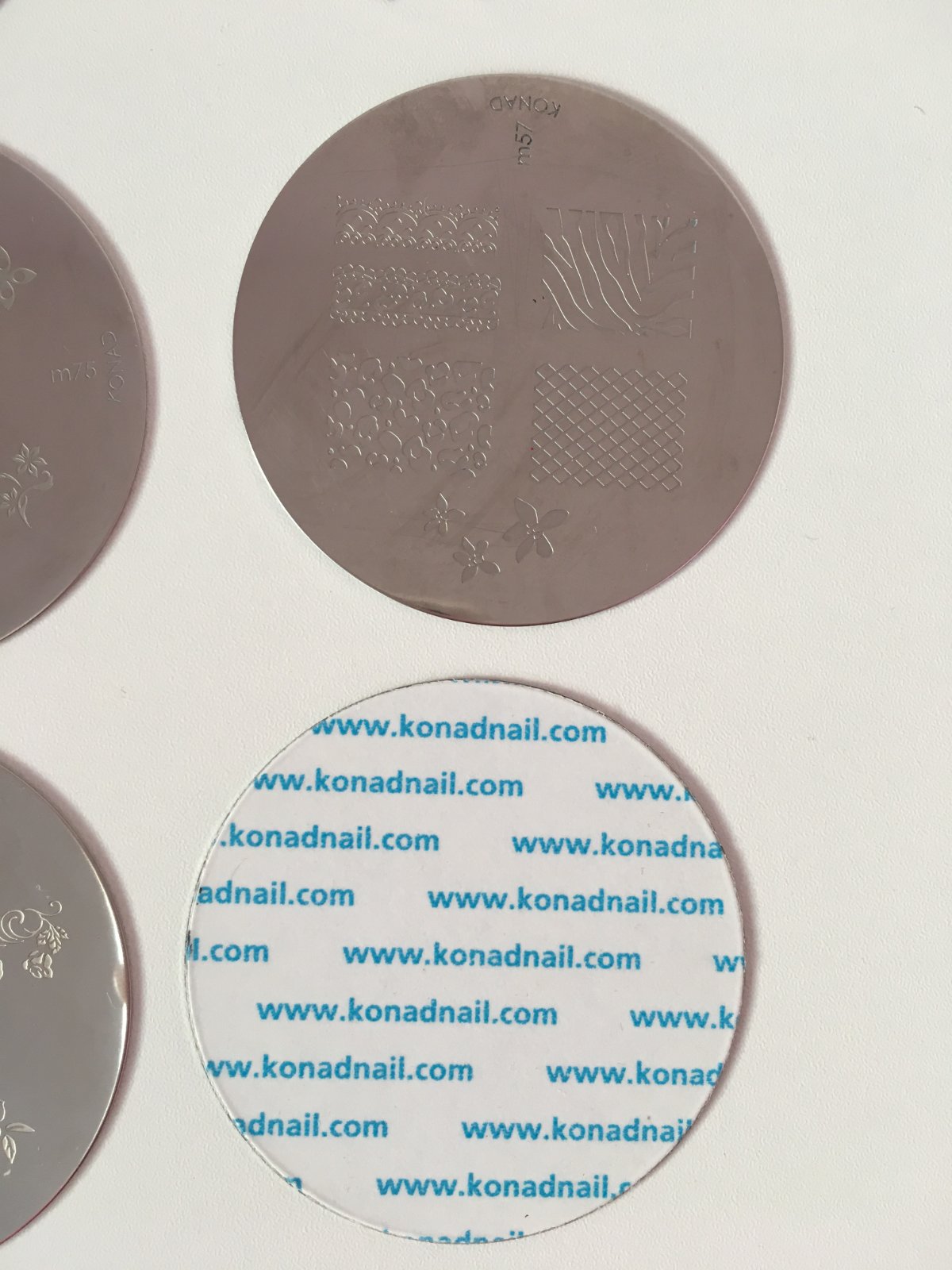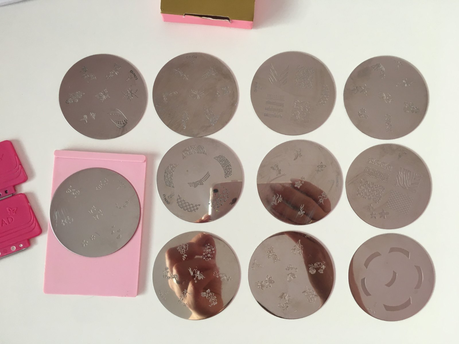 - zdobicí kovové zrcadlové destičky o průměru 56 mm (11 ks) - některé vůbec nepoužité,