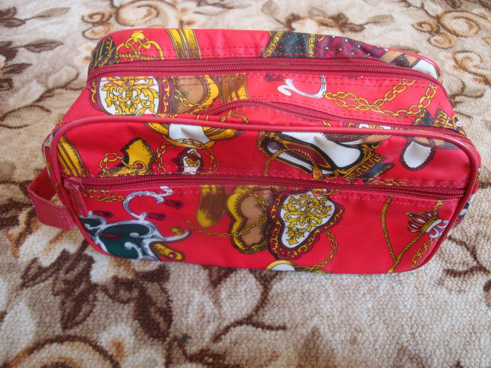 Pěkná kosmetická taštička v barvě červené s ornamenty. Taštička má spoustu úložného prostoru, má celkem 3 zipy (vše funkční). Velmi dobrý stav. Výše poštovného činí 59,-Kč doporučeně. Pro více informací mě prosím kontaktujte.