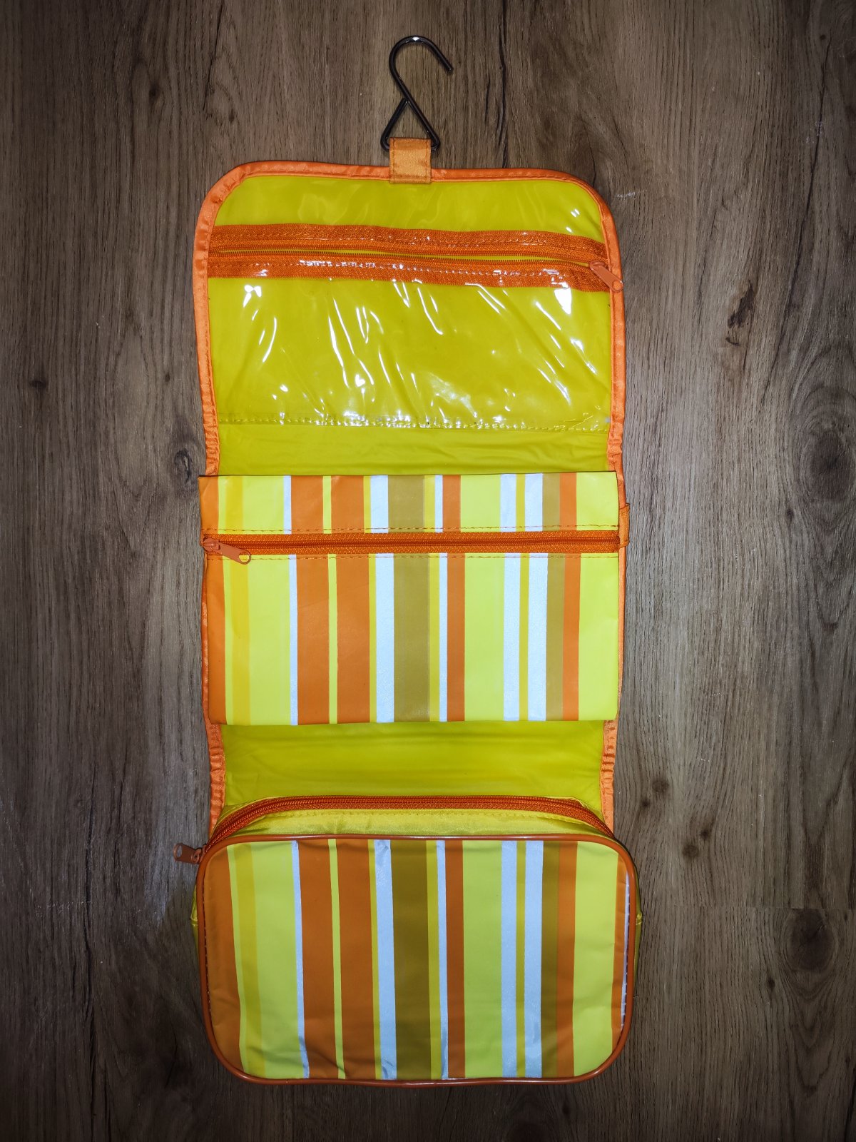 Prodám závěsnou kosmetickou tašku Avon v žluto-oranžových pruzích. Má více praktických přihrádek – průhlednou kapsu na zip, další dvě zipové kapsy a kovový háček na zavěšení – ideální na cestování i do koupelny. Stav je velmi dobrý, použila jsem 1x. Rozměry ve složeném stavu – 24 x 18 cm; v rozloženém stavu – 50 x 24 cm ( s háčkem 57 x 24 cm). Cena 100 Kč, v Brně možné osobní předání.