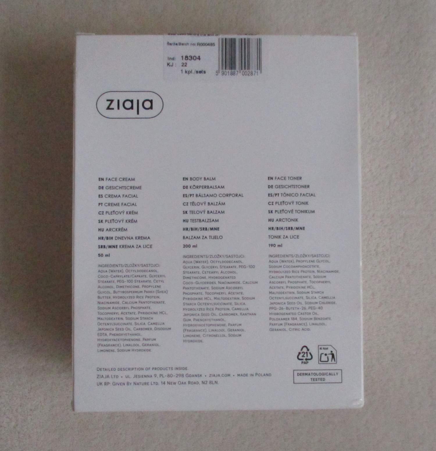 Prodám kosmetickou sadu zn. Ziaja, nová, nepoužitá. Nevhodný dárek. Sada obsahuje: 1x pleťový krém 50 ml, 1x hydratační tělový balzám 200 ml, 1x hydratační pleťové tonikum 190 ml. Veganský produkt, více než 90% složek přírodního původu.