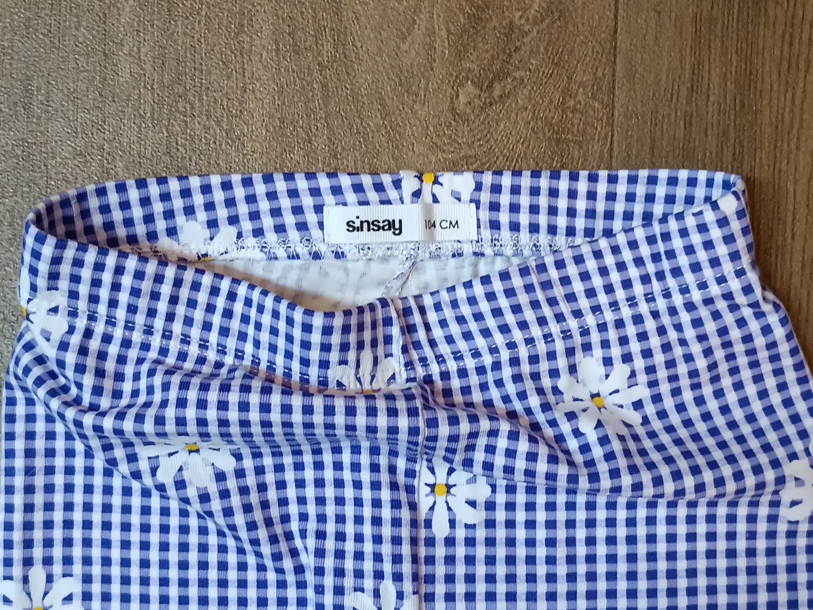 1) nové bavlněné modrobílé s kopretinama, zn. Sinsay, vel. 104, mašle u konce nohavic, pouze ustřižené cedulky, cena 50 Kč