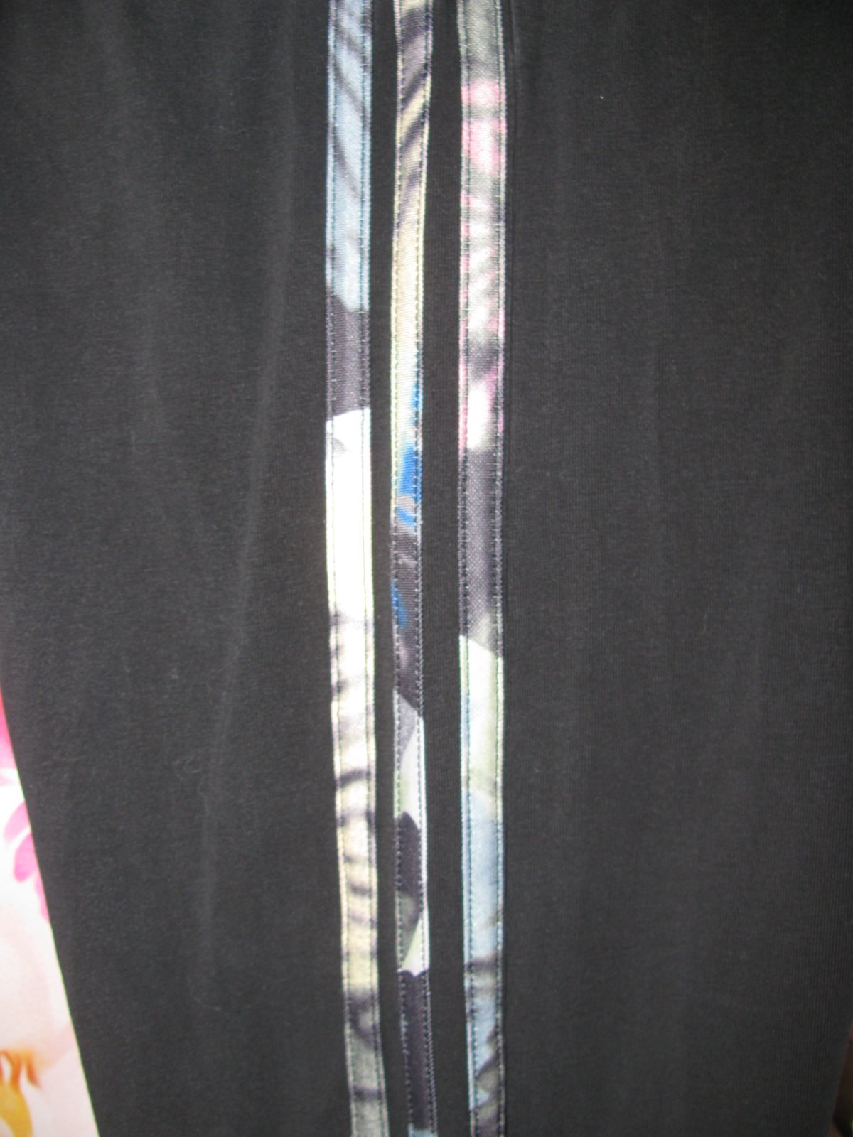 Hezké černé legíny, barevné pruhy, růžové logo-lehce se odlupuje-viz foto, široká guma v pase, 93% bavlna, 7% elastan.Trošku opraná černá barva, vzadu na gumě vykukuje pár gumiček-viz foto, nemá to vliv na nošení, raději upozorňuji pro pořádek.
