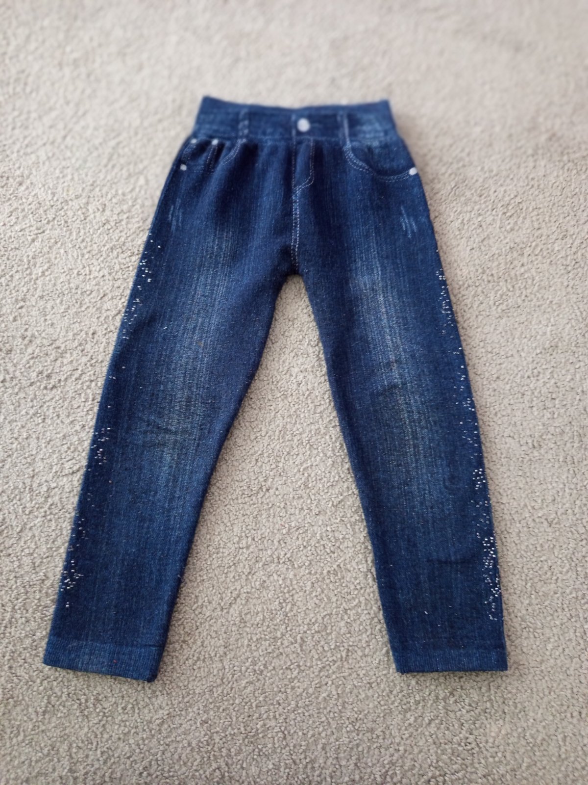 Velikost neuvedena, cca 110 - měřte. Spíš pro hubenou slečnu. Jsou slabounké s imitací rifloviny. Trochu žmolík, jinak v pořádku.