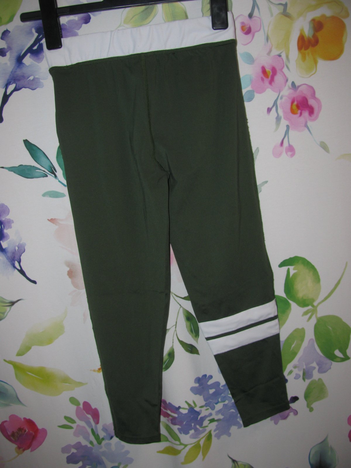 Tmavě zelené elastické legíny, v pase guma, zlaté logo. .Šev na boku jsem přejela na stroji, nic se nepárá, vše je v pořádku, to jen pro jistotu-upozorňuji pro pořádek, viz foto, jinakTop stav bez jiných vad. 80% nylon, 20% elastan.