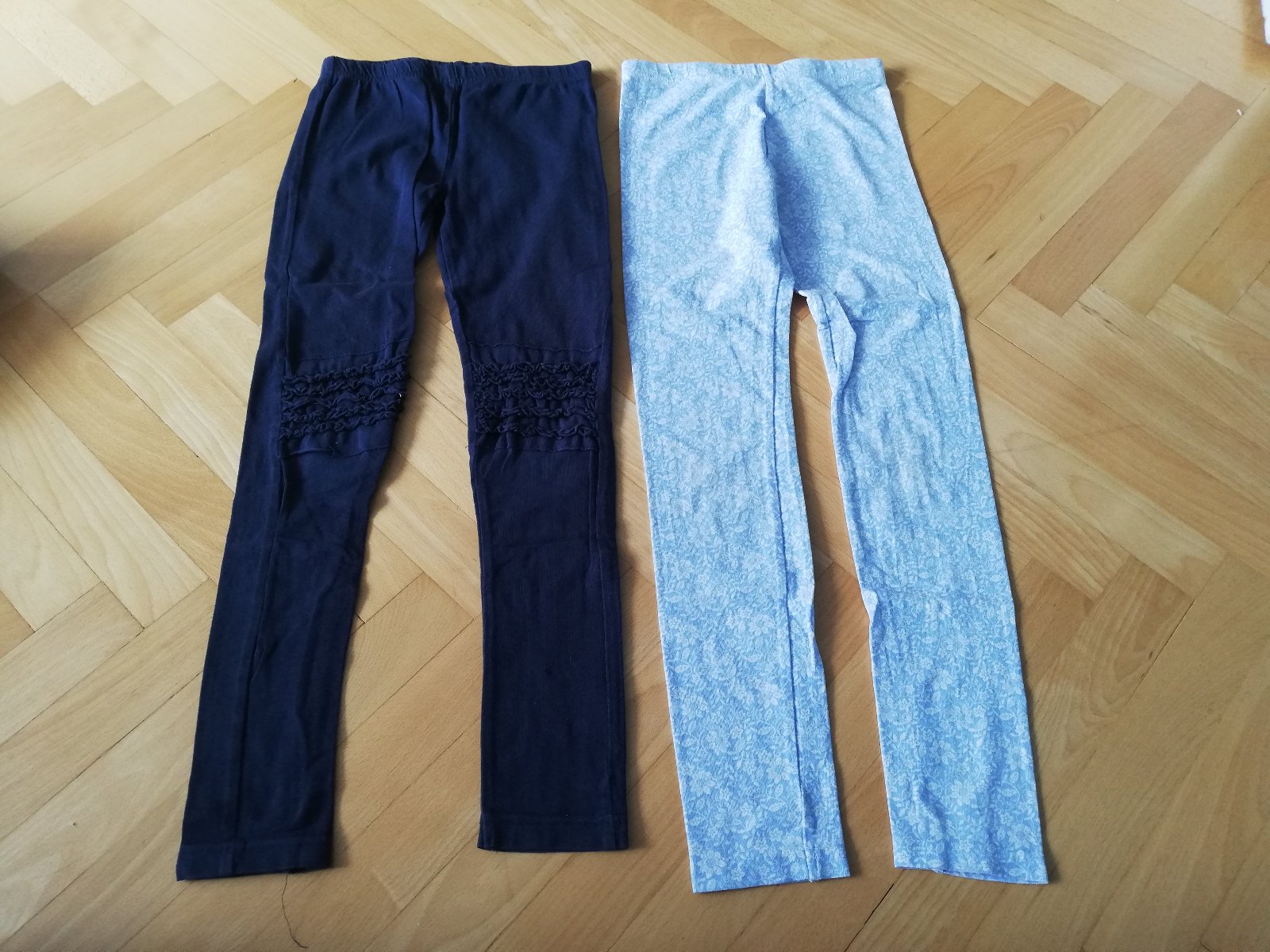 Dvoje nošené legínky, světlejší mají mírně ušpiněné kolena, ale nic hrozného, tmavé trochu vybledlé praním. Cena za oboje.