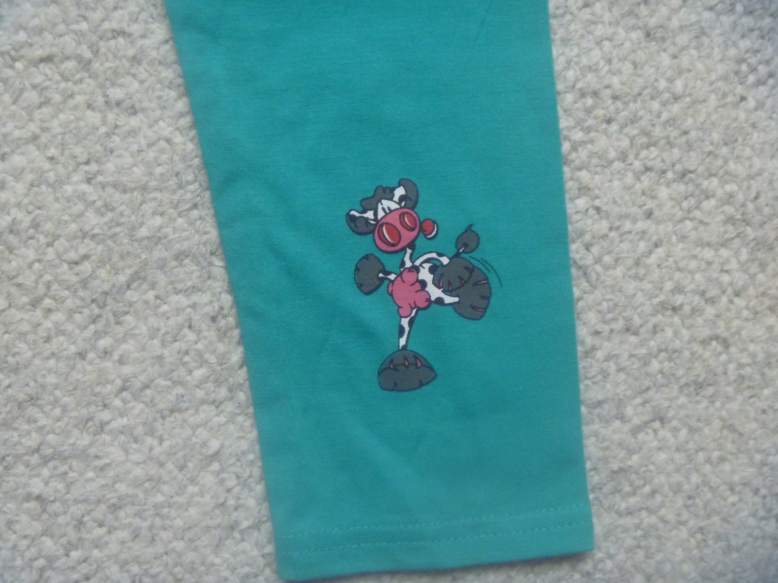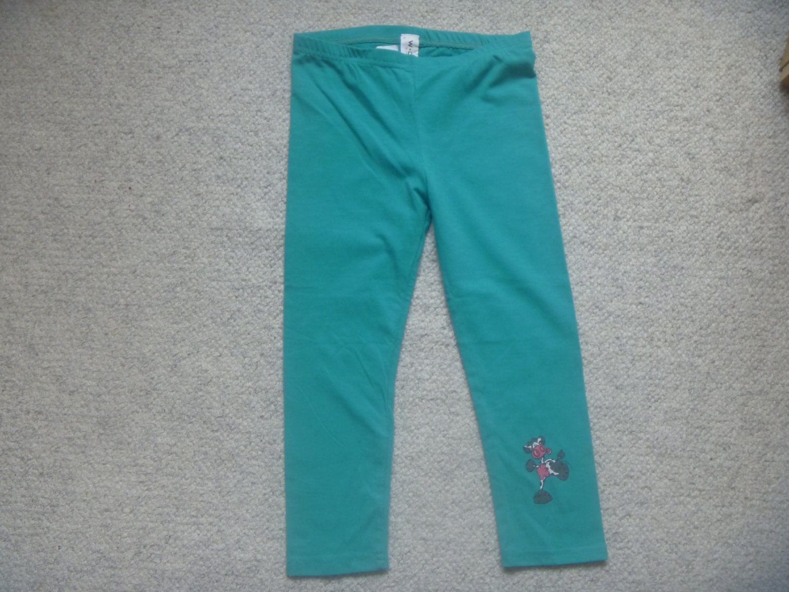 Prodám nové zelené legíny s postavičkou na nohavici, značka C.M, velikost 116/122, celková délka 59 cm.