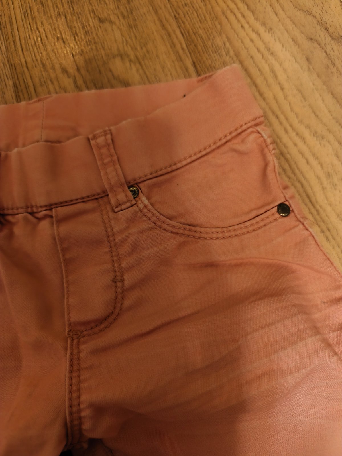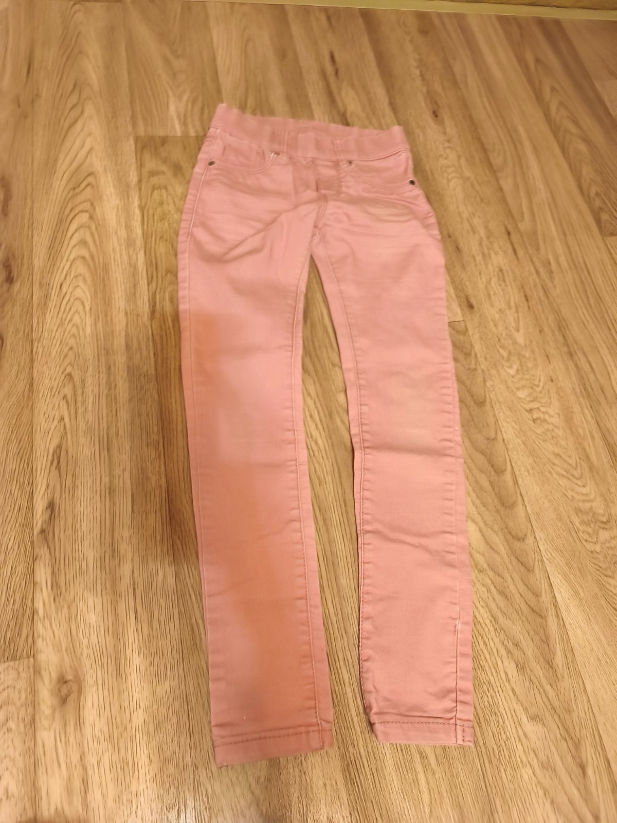 Hodně nošené džegíny, odřeniny, odrbané. Ještě poslouží. Vel.134, jsou delší.
