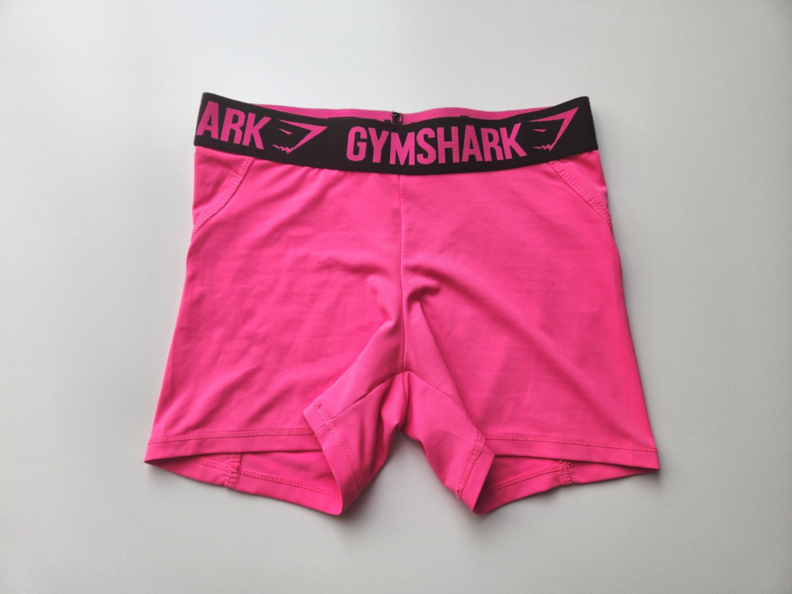 Neonově růžové sportovní krátké legíny zn. GYMSHARK, v pase široká plochá guma s logem.