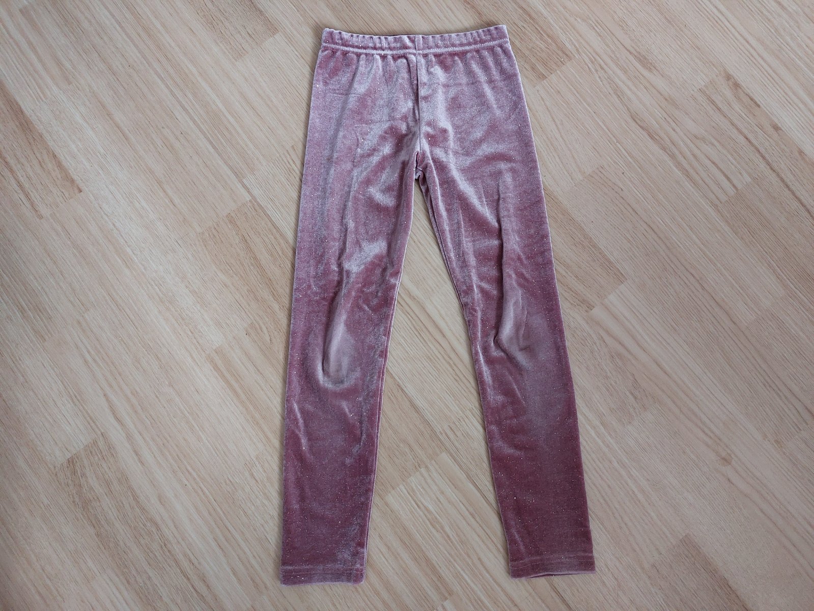 Oblíbené legíny ze sametového materiálu se zlatými třpytkami. Barva starorůžová. Na kolínkách chloupek otlačený, ale látka je tam stále silná, neprodřená. Je to tak na donošení pro nenáročné.