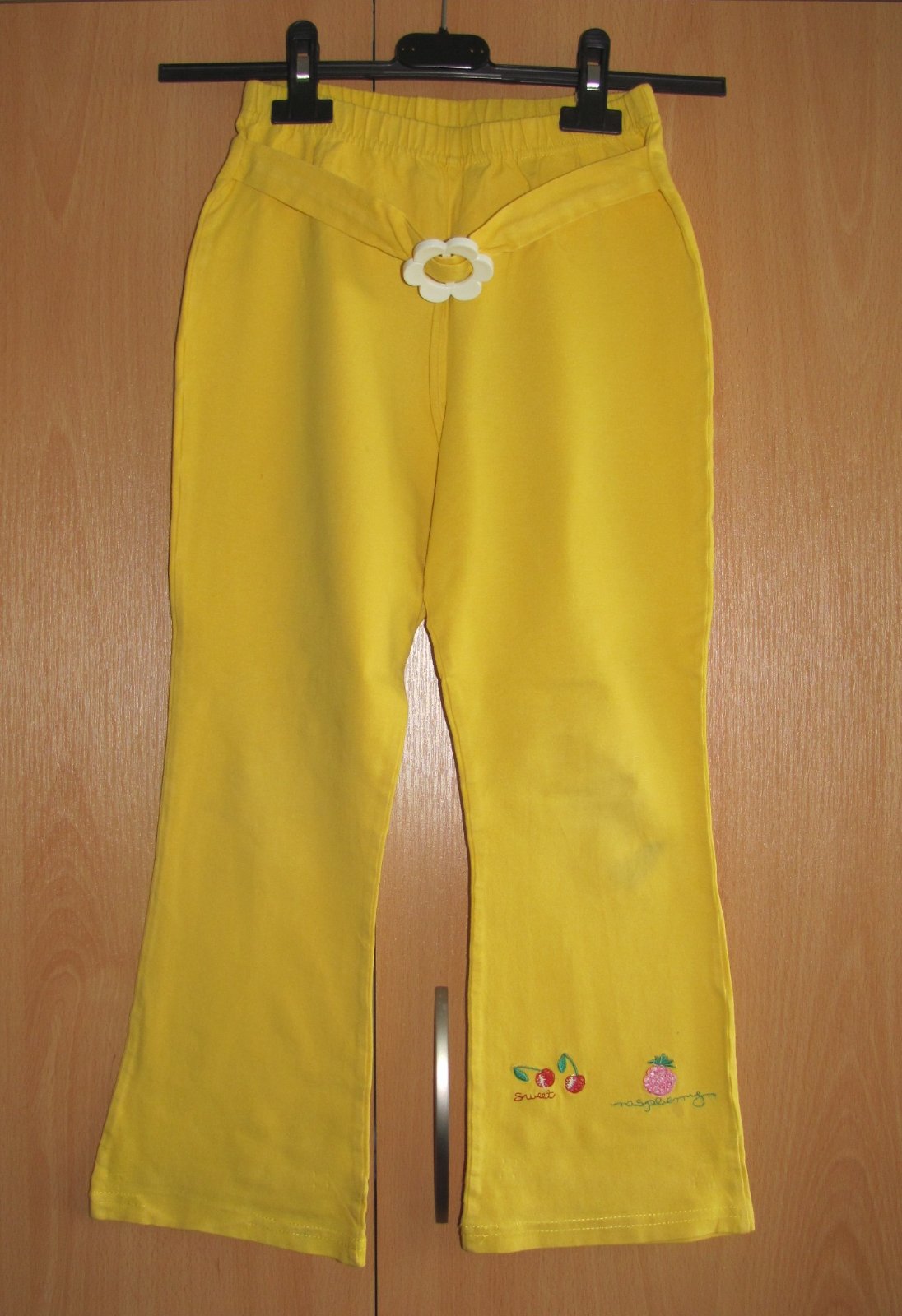 Svítivě žluté tenké bavlněné legíny s puntíky. Nošené jednou. Délka 72 cm, v pase šířka 25,5 cm.