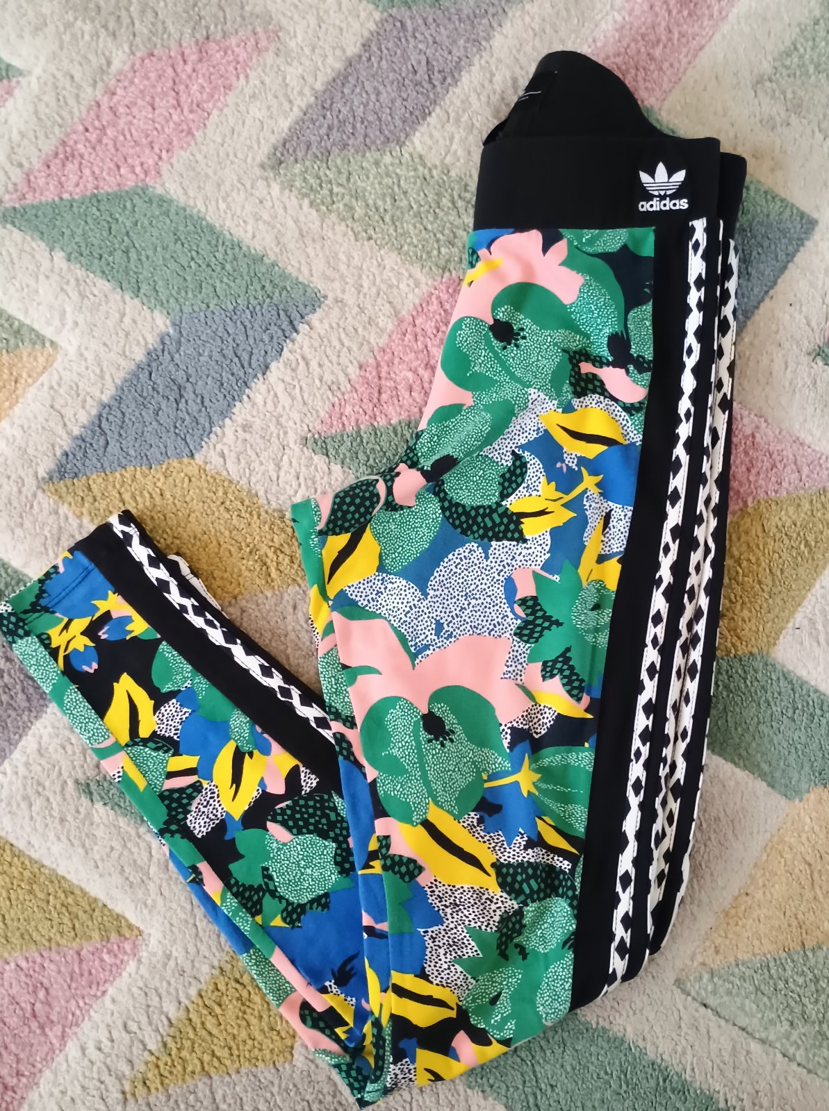 Hezké černé legíny, barevné pruhy, růžové logo-lehce se odlupuje-viz foto, široká guma v pase, 93% bavlna, 7% elastan.Trošku opraná černá barva, vzadu na gumě vykukuje pár gumiček-viz foto, nemá to...
