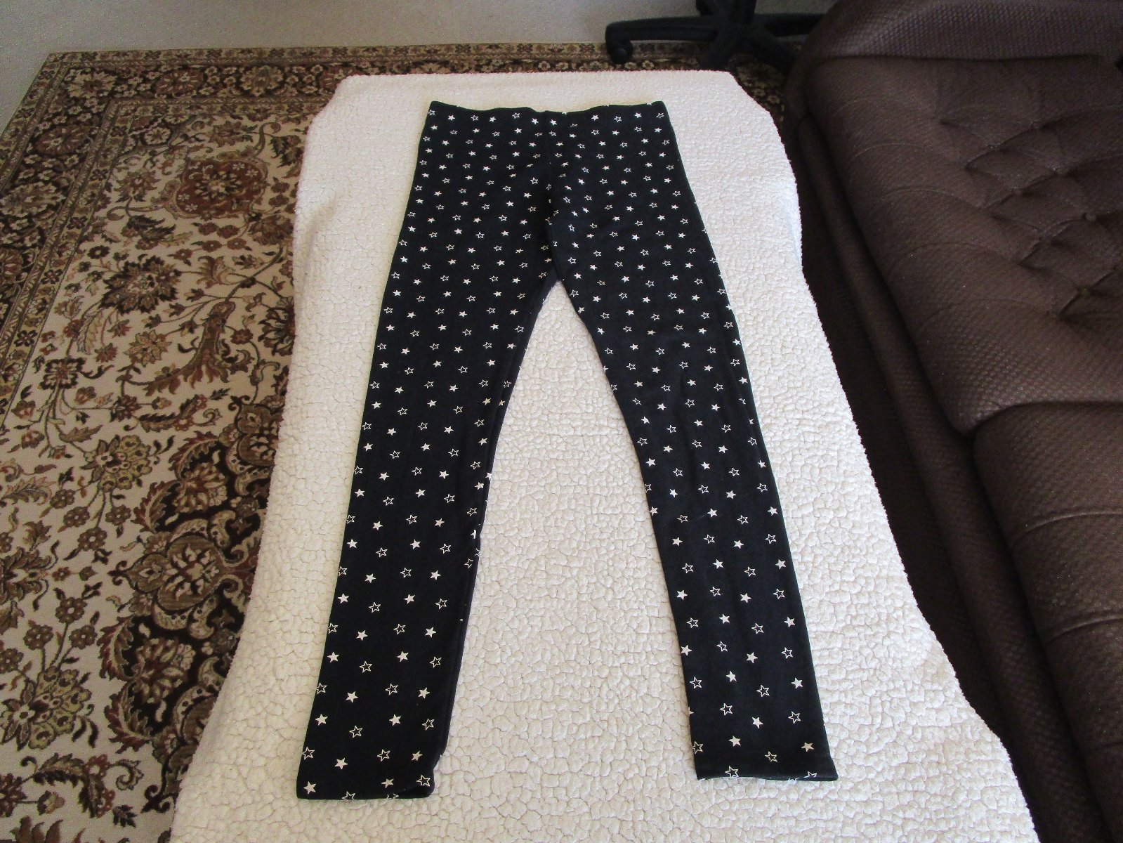Téměř nenošené teplejší černé bavl. elat. legíny s bílými hvězdami, v pase guma, vel. 152-158, délka odshora dolů 84 cm, cena jen 89 Kč, z Tesca.