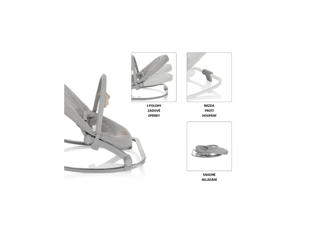 Lehátko je vhodné od narození do 18 kg. Možnost houpání nebo fixace. 3 stupně intenzity vibrace. Melodie ukolébavky nebo zvuků přírody. 3 úrovně hlasitosti melodií. 3 stupně polohování zádové opěrky. Snadno snímatelný a pratelný potah. Skladné, nezabere místo.