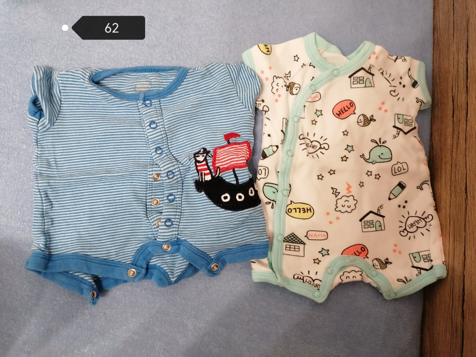 Body je zavinovací, nemusí se tedy miminkům přetahovat přes hlavičku. My už koupili pozdě, takže obléknutá jen k lékaři. Cena za obě.