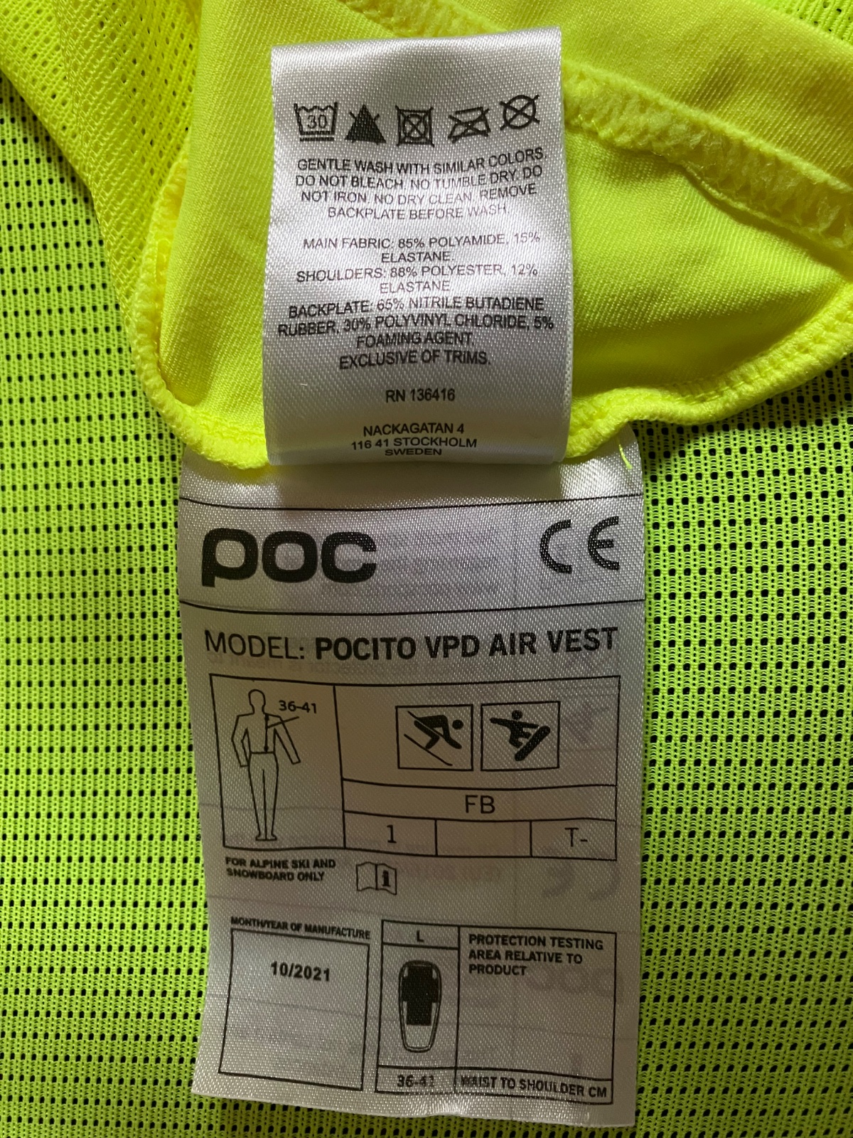 Chránič páteře POCITO VPD AIR VEST ve vel L. na délku trupu 36-41 cm, viz štítek. Reflexně žlutá barva. Vlastní chránič vyndatelný, vesta pratelná.