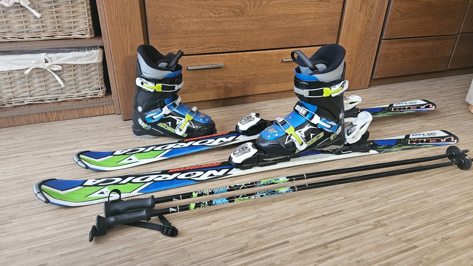 Prodám kvalitní dětský lyžařský komplet (vše jak je na fotce: lyže+lyžáky+hůlky)