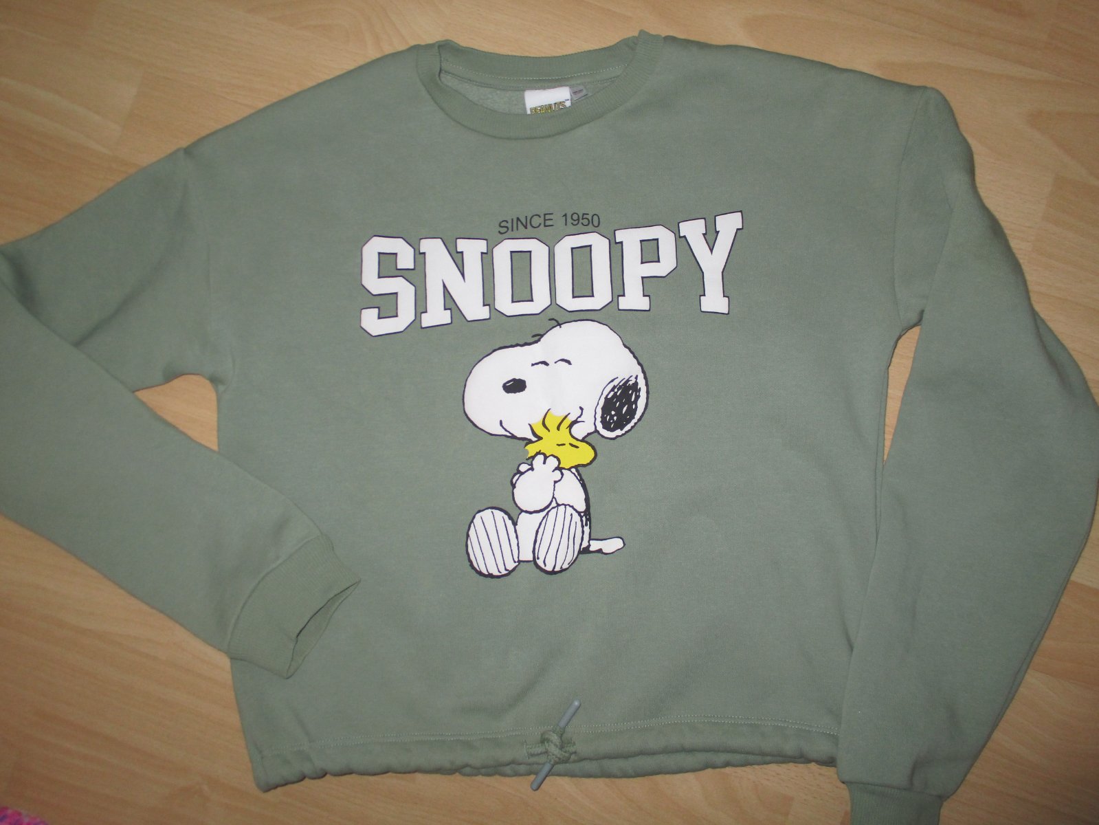 Krásná kvalitní tepláková silnější mikina s obr. pogumov. Snoopy, dole tunýlek se šňůrkou, dl. 51, š. 2x48 cm, jako nová
