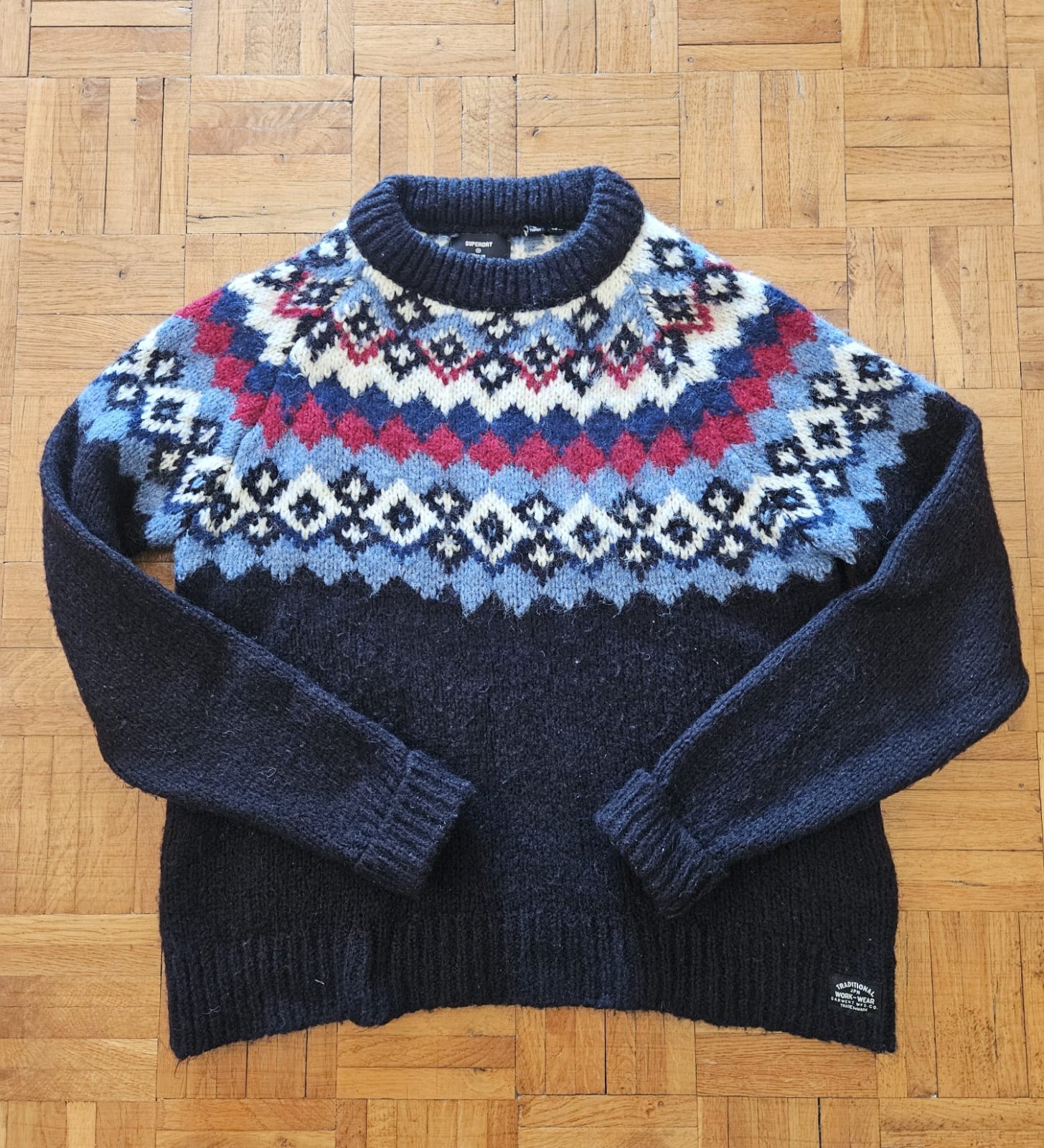 krásný vkusný svetr M, , Super Dry- vysoká kvalita, běžná cena těchto svetrů 1500-2300kč, Vintage Nordic Knit,vkusný dámský,pánský,dětský......komu sedí,,délka 64cm,rukáv od krku 73cm, pružný, skvě...