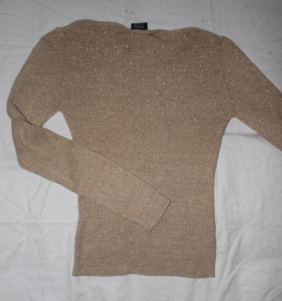 Vyřazeno z přeplněného šatníku naší Viki, pružný, vroubkovaný, s větším výstřihem, ve velmi dobrém, bezvadném stavu, málo nošen, tenčí, příjemný materiál, béžový se zlatou nitkou,