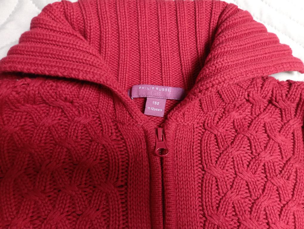 Prodám dívčí svetr zn. Philip Russel, propínací na zip, barva tmavě červená, velikost 152, nošený, ale top stav, bez vad. Cena 200,-- Kč.