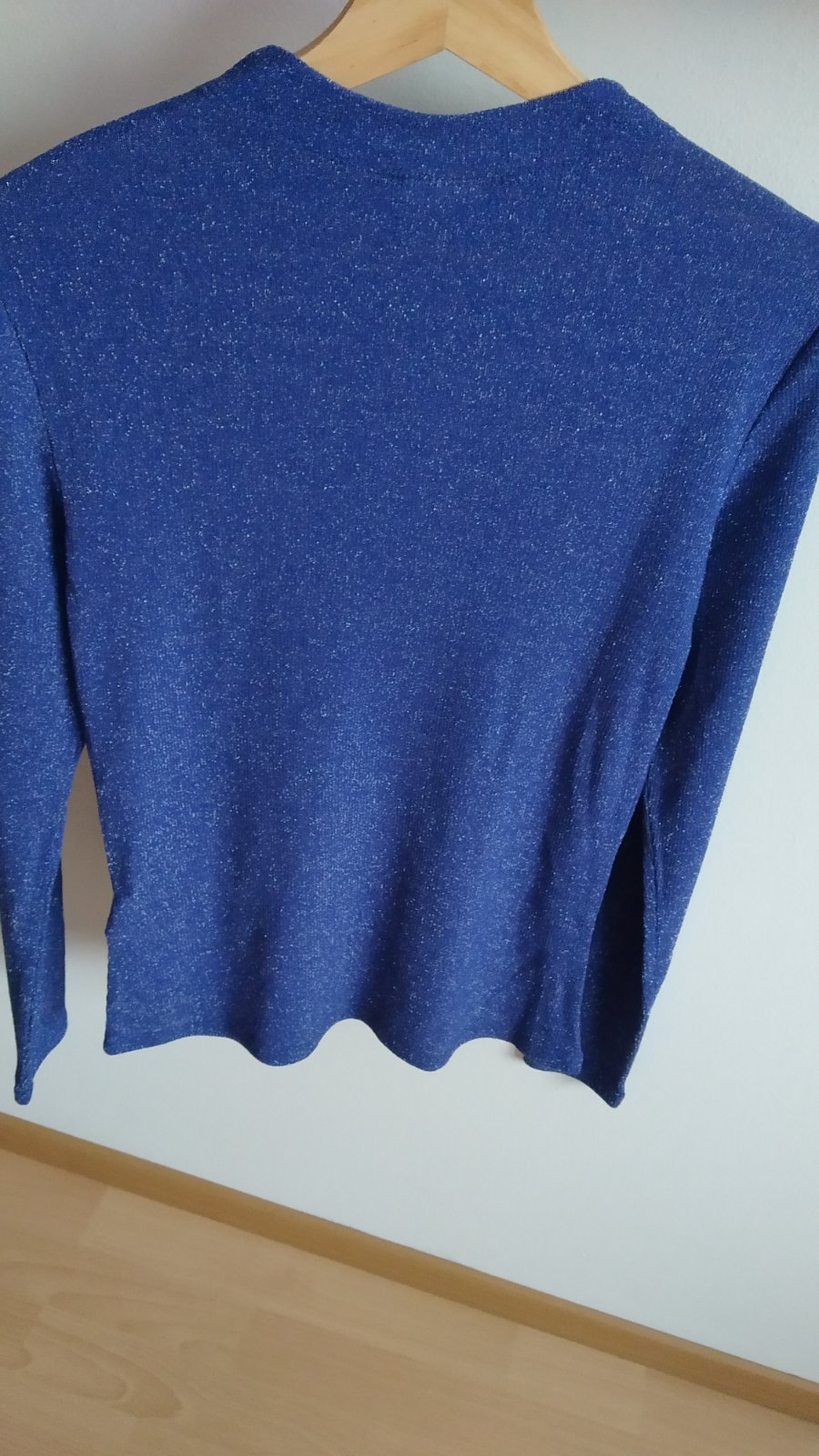 Prodám svetr, velikost cca L, rozměry – délka od ramen 63, 5 cm; šířka v podpaží 52 cm; délka od krku 65 cm. Materiál 70% akryl, 30% vlna. Ve svetru jsou zlatavá třpytivá vlákna, na rukávech zlaté ...