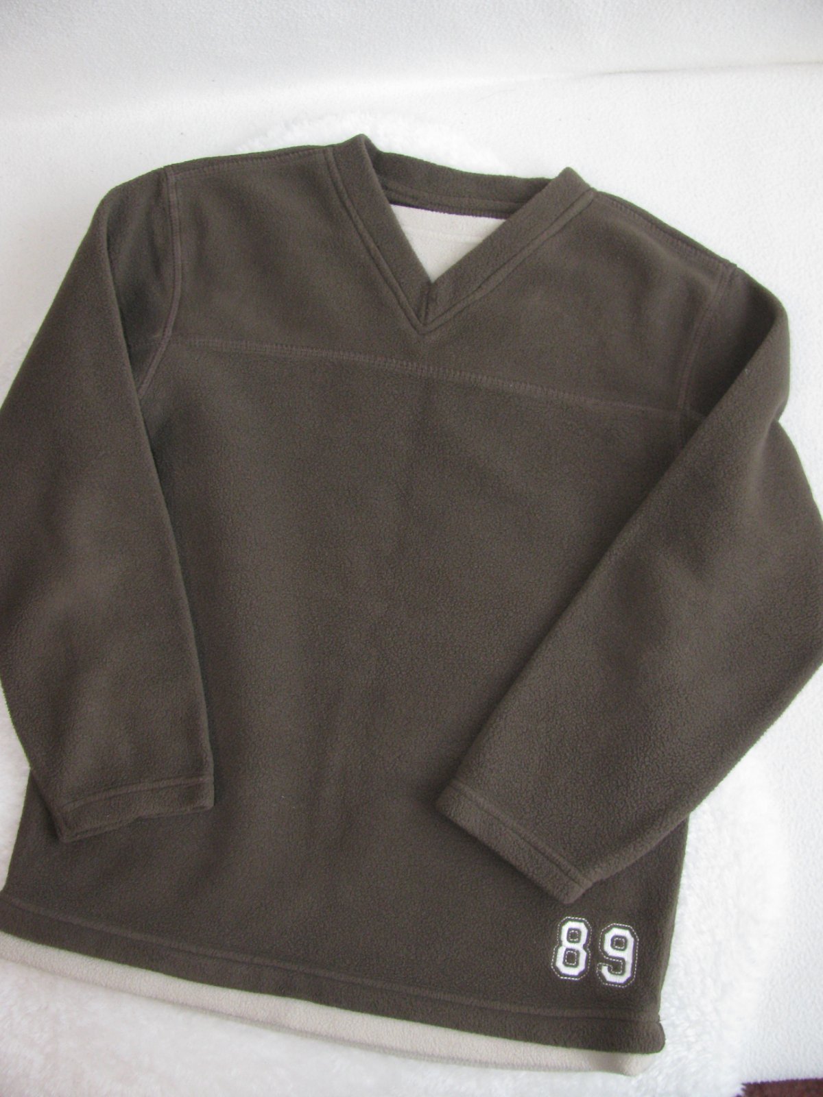 Hezká khaki mikina, doplněna béžovými vsadkami, vyšité číslo, jemný fleec, 100% polyester. Top stav bez vady.