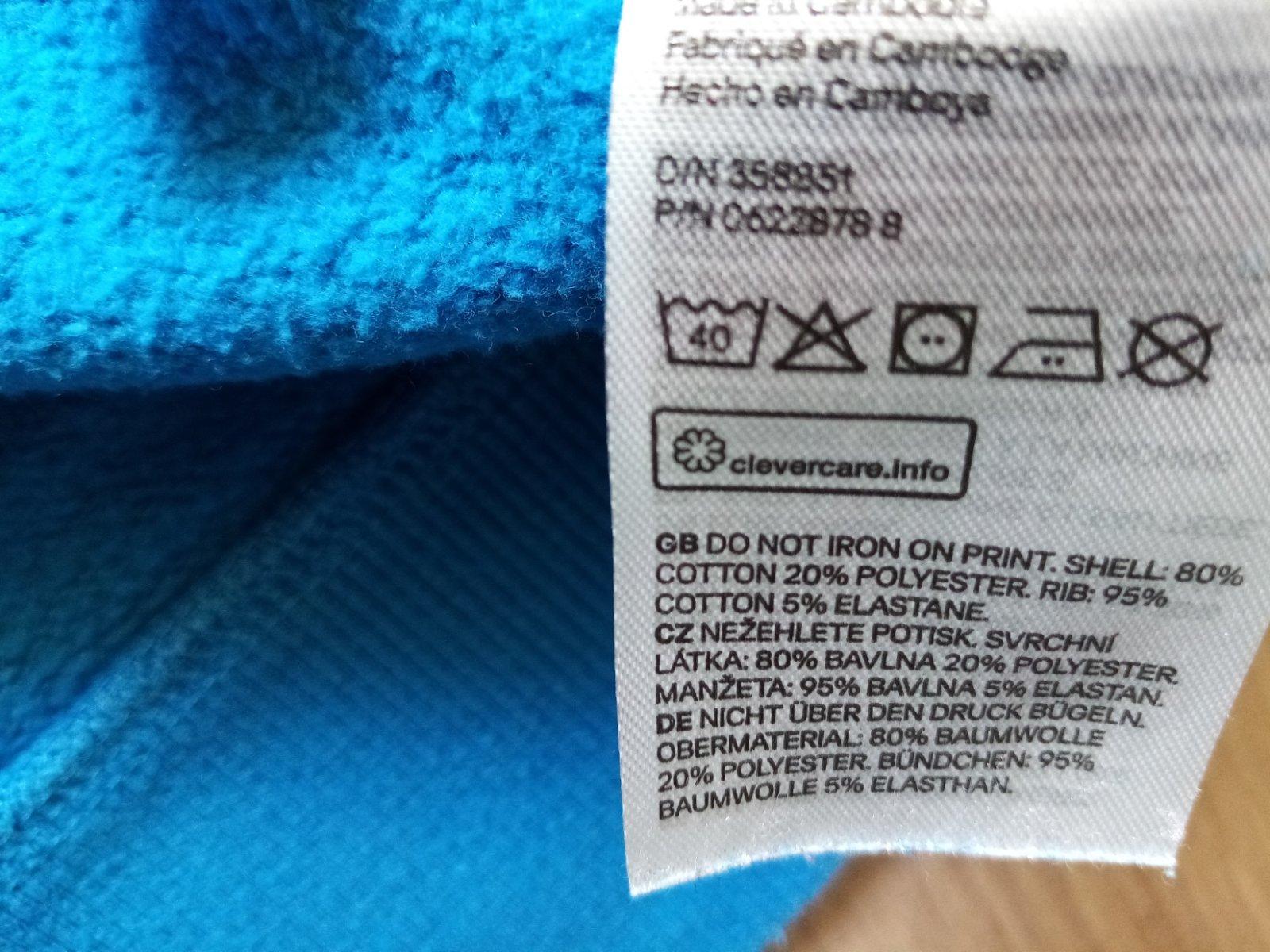 70% BAVLNA A 30% PES - DRŽÍ TVAR A NEVYTAHUJE SE. KRÁSNÁ MODRÁ MELÍROVANÁ BARVIČKA - UVNITŘ CHLOUPEK - TEPLEJŠÍ. VPŘEDU SUPER ZELENOBÍLÁ APLIKACE A KLOKANÍ KAPSA. KAPUCKA PODŠITÁ BAVLNOU. NOŠENÁ - ...