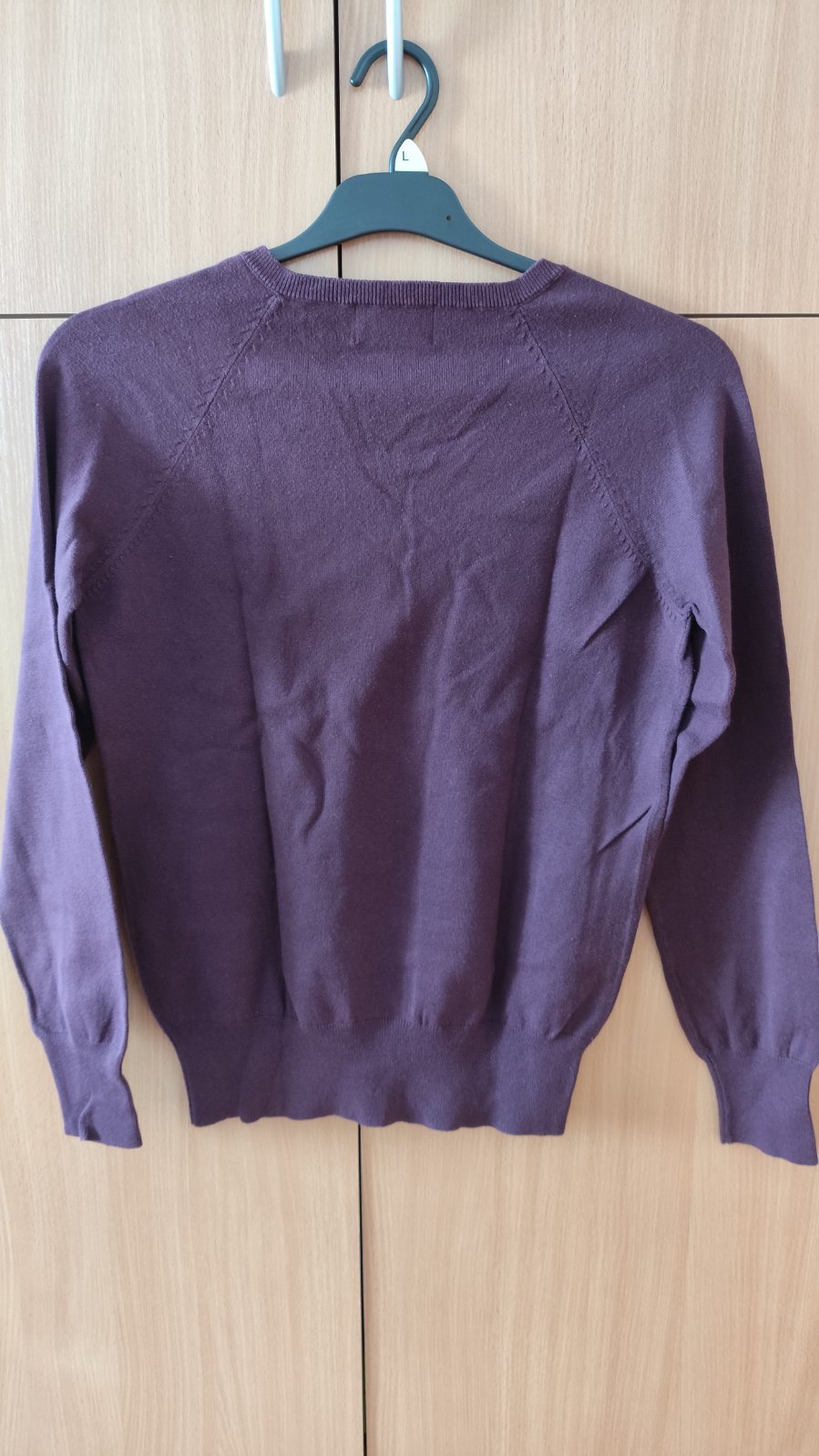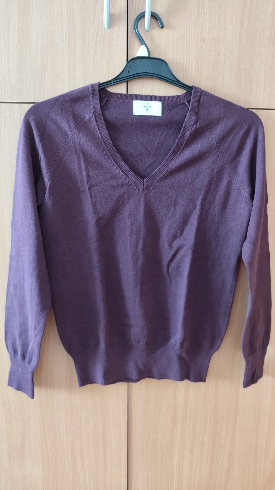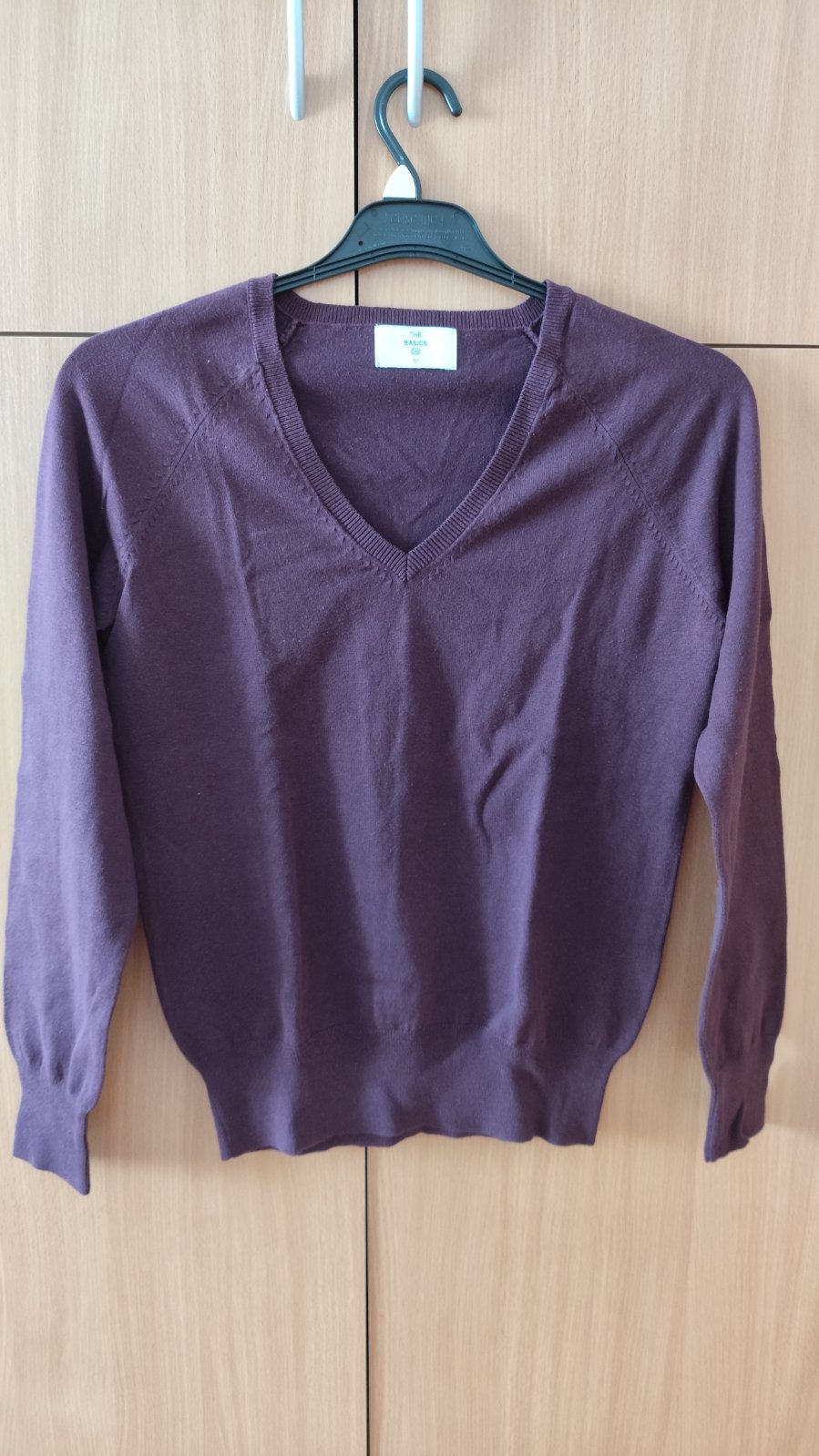 Svetřík jsem měla 1x na sobě, je v krásném stavu, bez vad, mám jej bohužel velký. Barva svetříku je vínově červená (odpovídá úvodní fotce), má 3/4 rukáv, v pase je pásek na gumu, díky tomu lze páse...