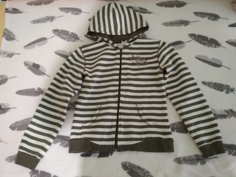 Prodám hezkou dívčí mikinu s kapucí zn. INCSCENE, proužkovaná - bílý a khaki proužek, velikost 158-164, nošená ale bez vad, v dobrém stavu. Rozpínací po celé délce na zip, na předním díle 2 kapsy a obrázek růžičky. Velmi příjemný materiál, teplákovina (60 % bavlna a 40 % polyester) Cena 90,-- Kč + poštovné.
