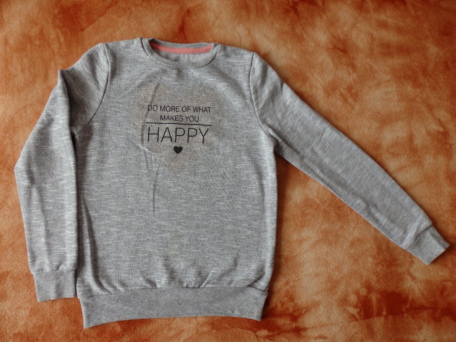 Pěkná slabá mikinka nebo silnější tričko, vel. 134/140, barva šedý melír, nápis v blýskavém srdíčku. Dobrý stav.
