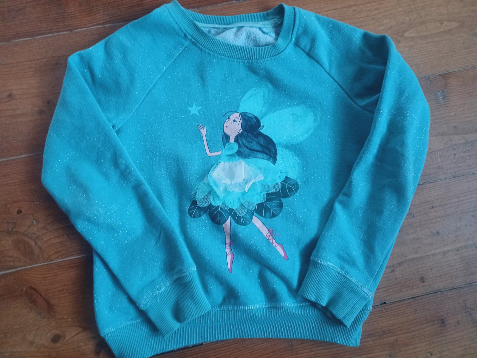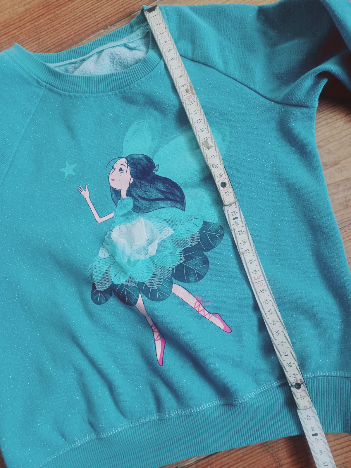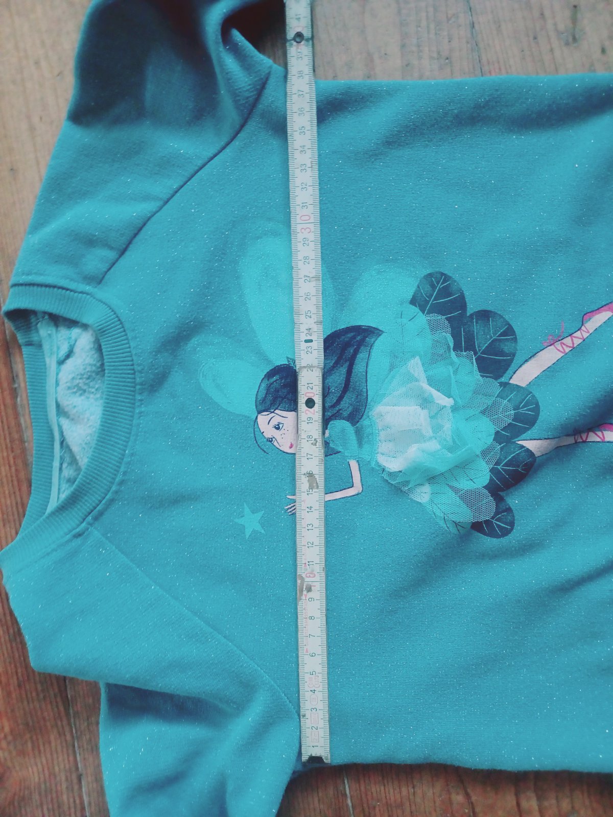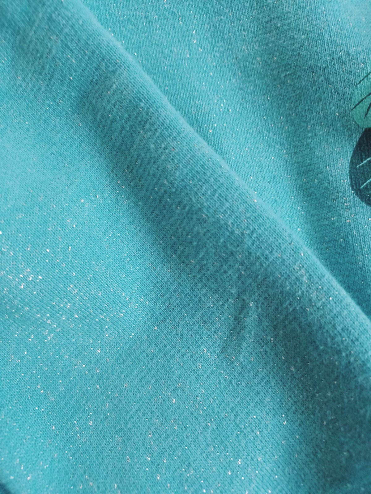 Svetr krásné tyrkysové barvy, celý protkaný stříbrnou nitkou, uvedená velikost 134, ale za mě menší, rozměry viz foto. Bez vad.