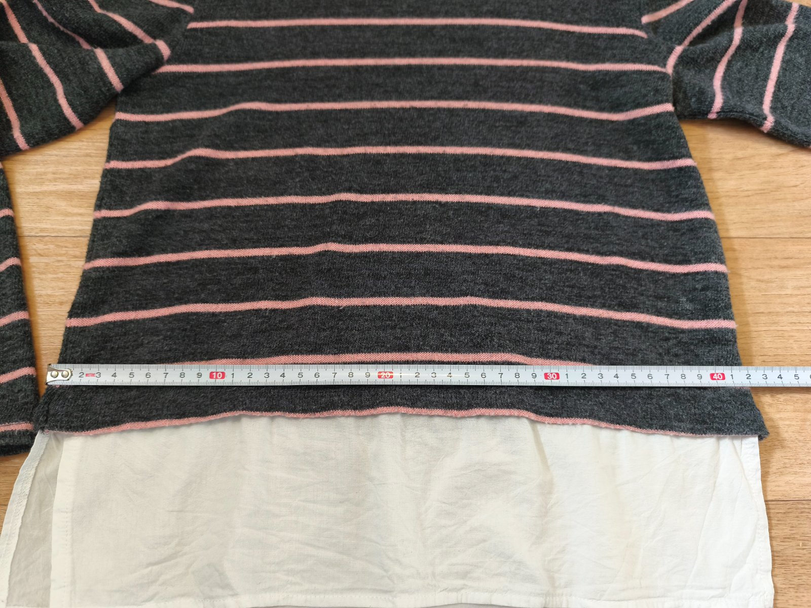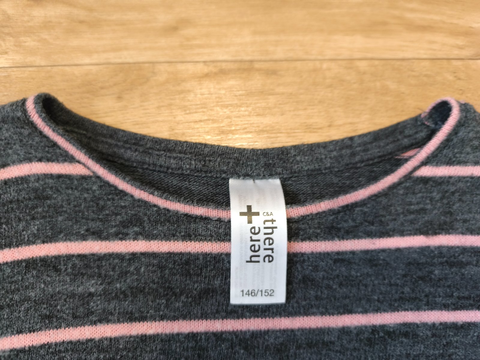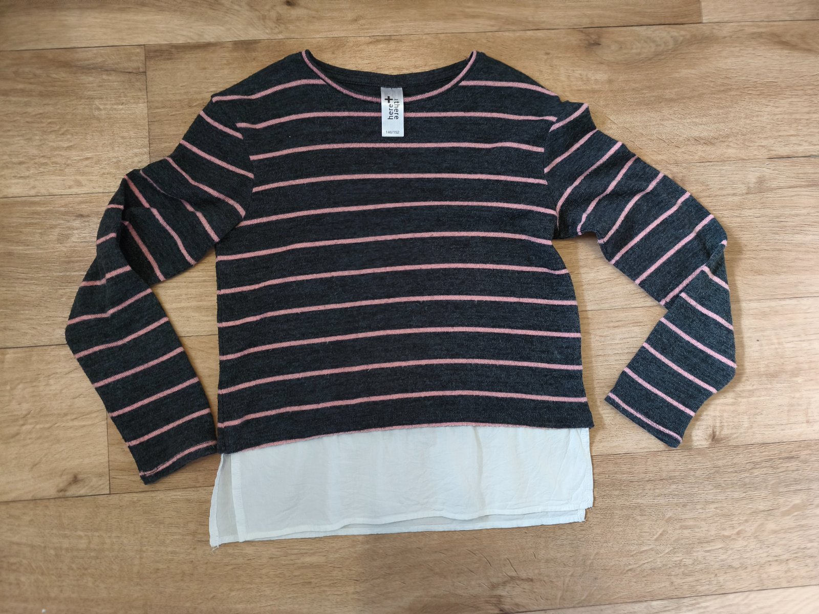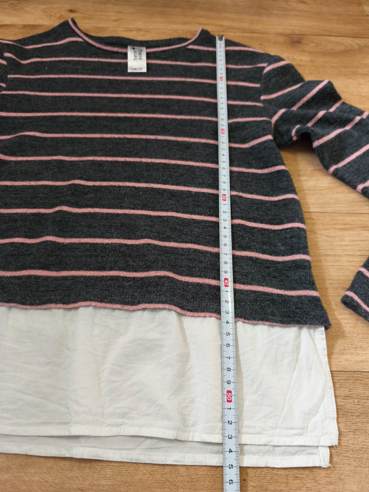 Tmavě šedý svetr s růžovými pruhy, s efektem 2v1 (v dolní části "košile"). Velikost 146/152 - rozměry na fotkách. Zn. Here&there.