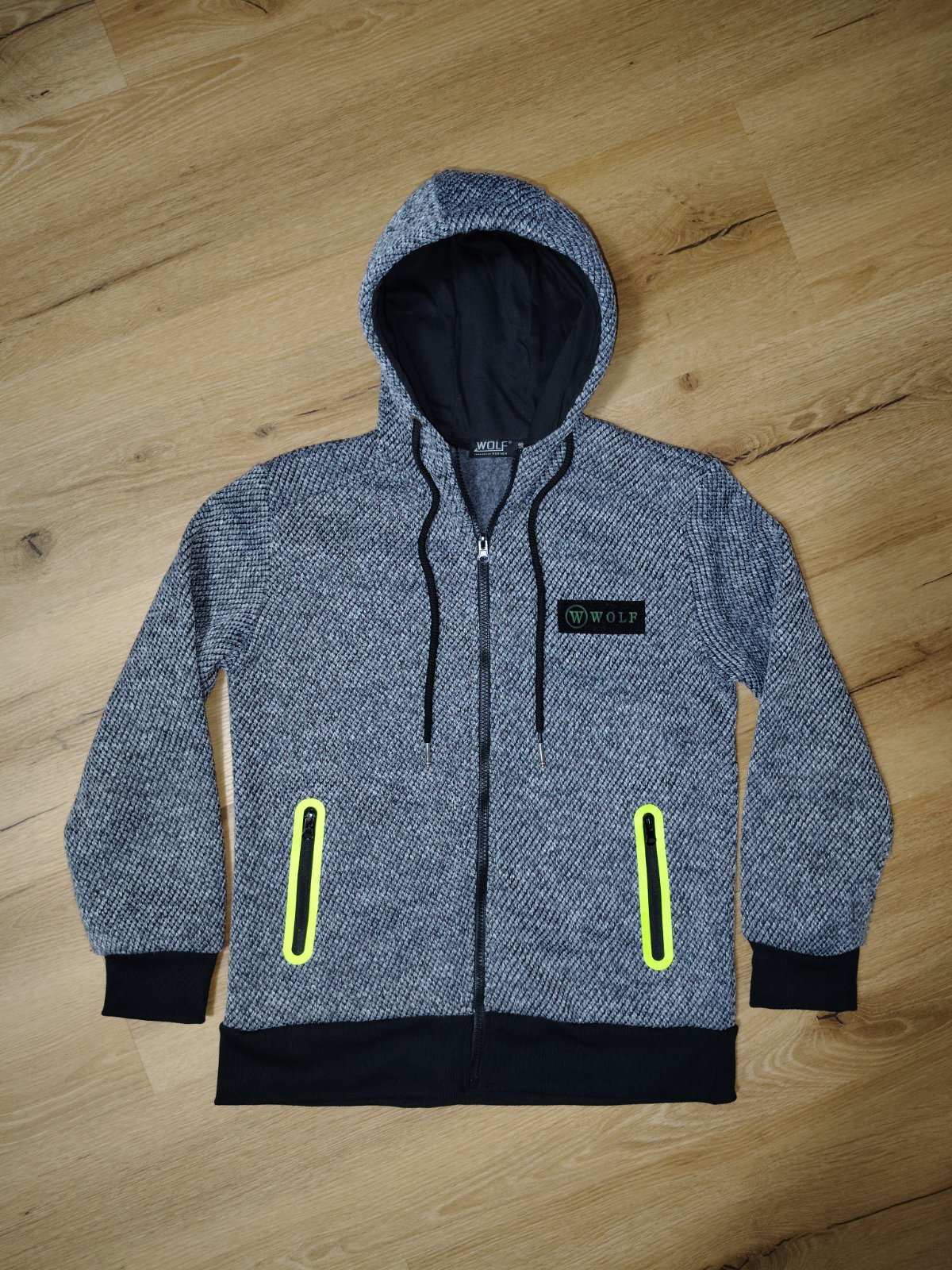 Kvalitní dětská zateplená propínací mikina WOLF 152 s kapucí, propínací na zip, neon prvky. Kapuce podšitá černou látkou. Po straně jsou dvě kapsy, zevnitř je zateplená měkoučkým chloupkem.