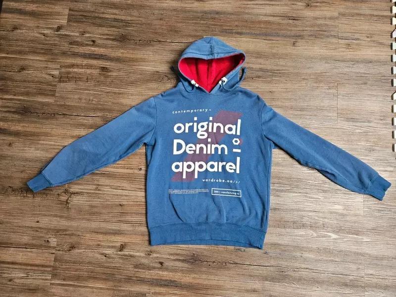 Modrá mikina pánská s kapucí velikost M Fishbone délka 62 cm,šířka v průramcích 56 cm, rukávy od ramenního švu 64 cm Vada potrhana bílá část u šňůrek