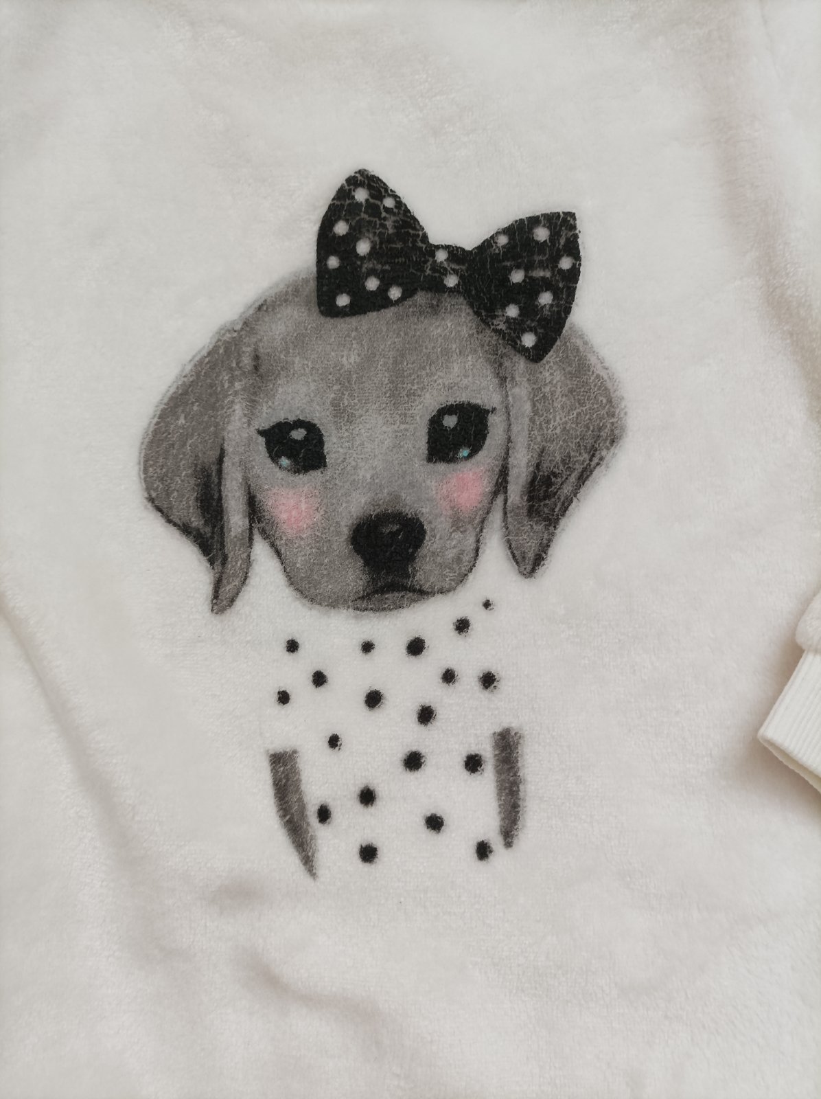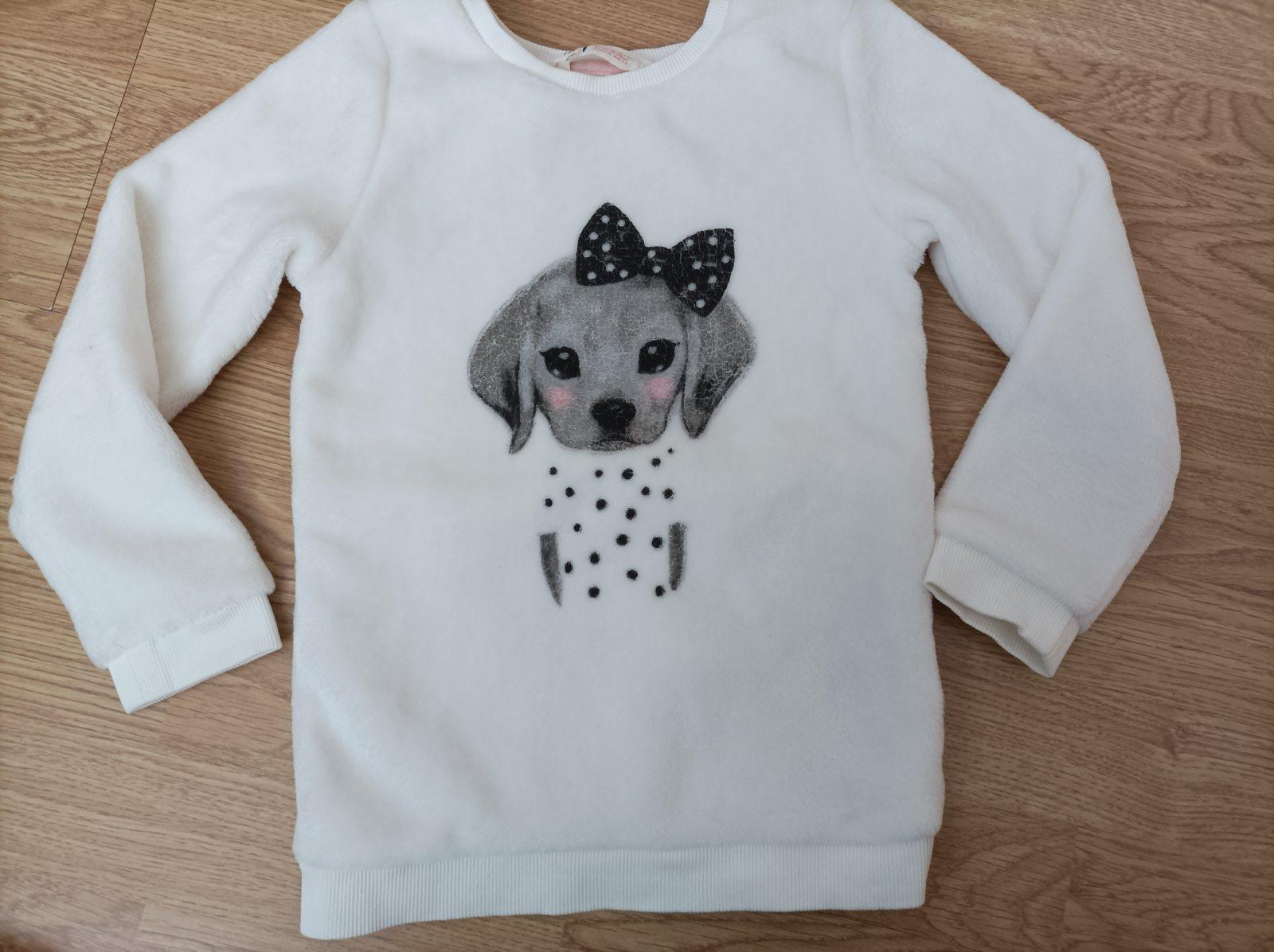 Plyšová mikina s aplikací pejska, je nošená bez flíčků, dírek, žmolků. Uvedená velikost 110/116.