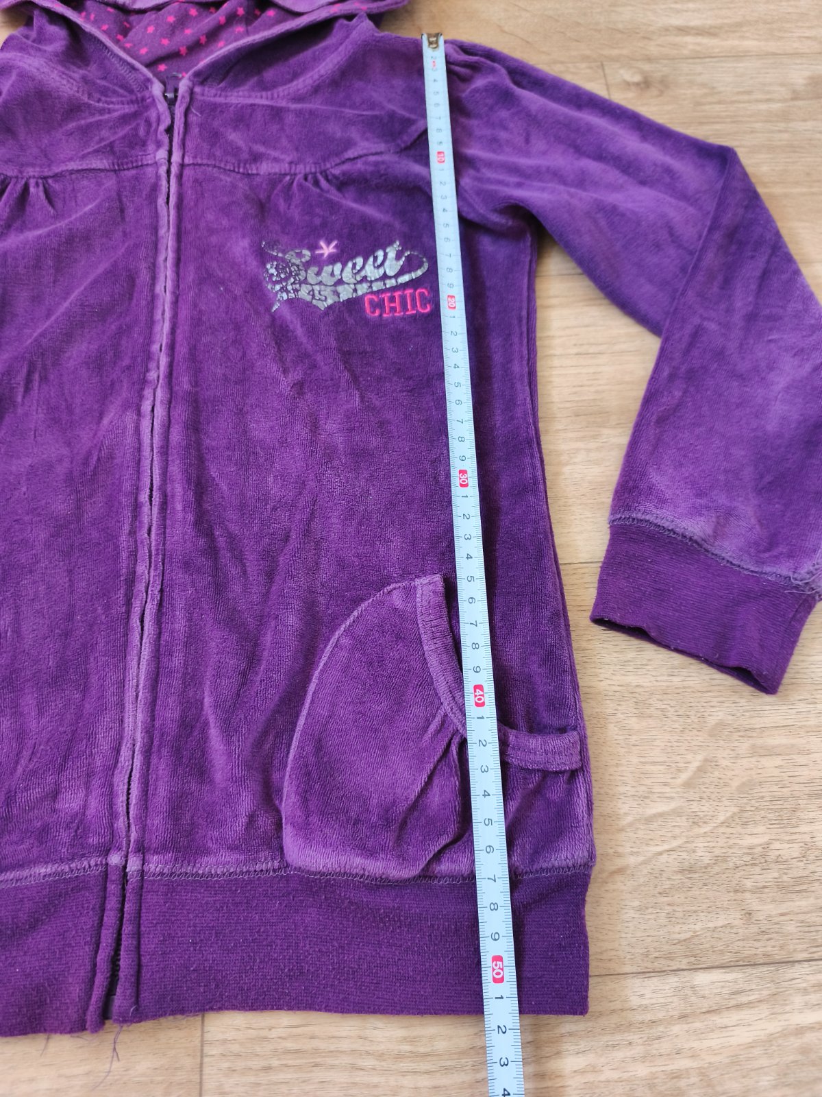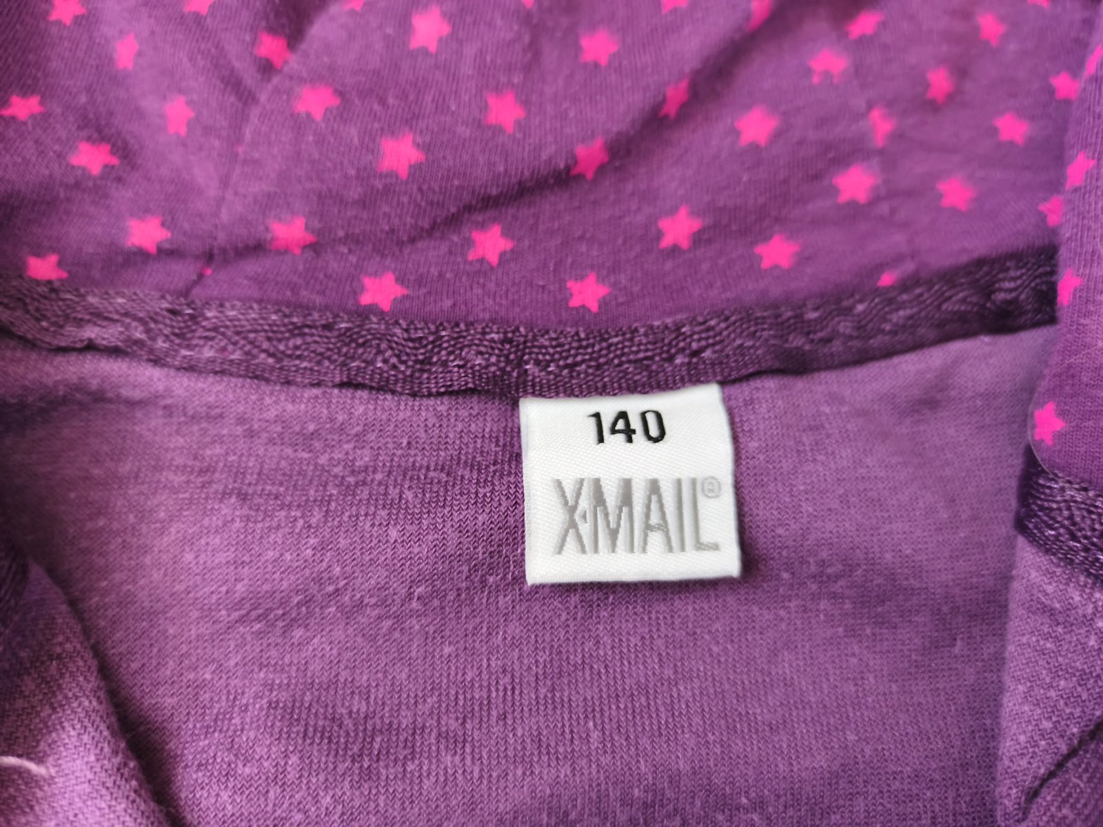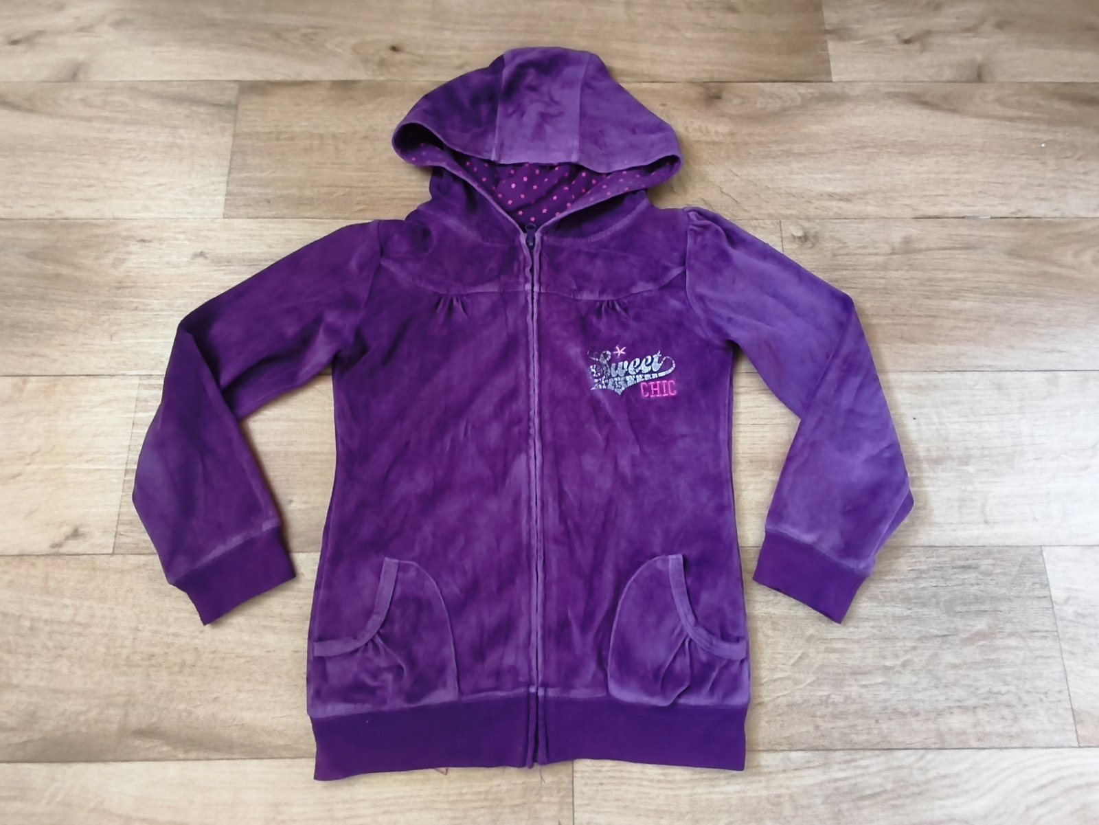 Tmavě fialová mikina s kapucí. Velikost 140 - rozměry na fotkách. Nošená více.