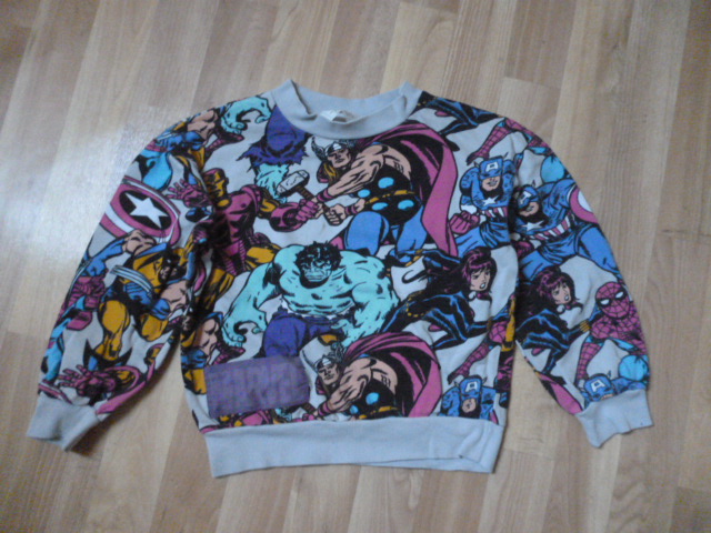NOŠENÉ, PĚKNÁ, na konci rukávu na lemu je pidi tečka, nevim zda půjde vyprat, DÉLKA JE 45 CM, rukáv od krku je 53 cm, průramky 2x44 cm, psaná vel. 6-8 zn.Marvel