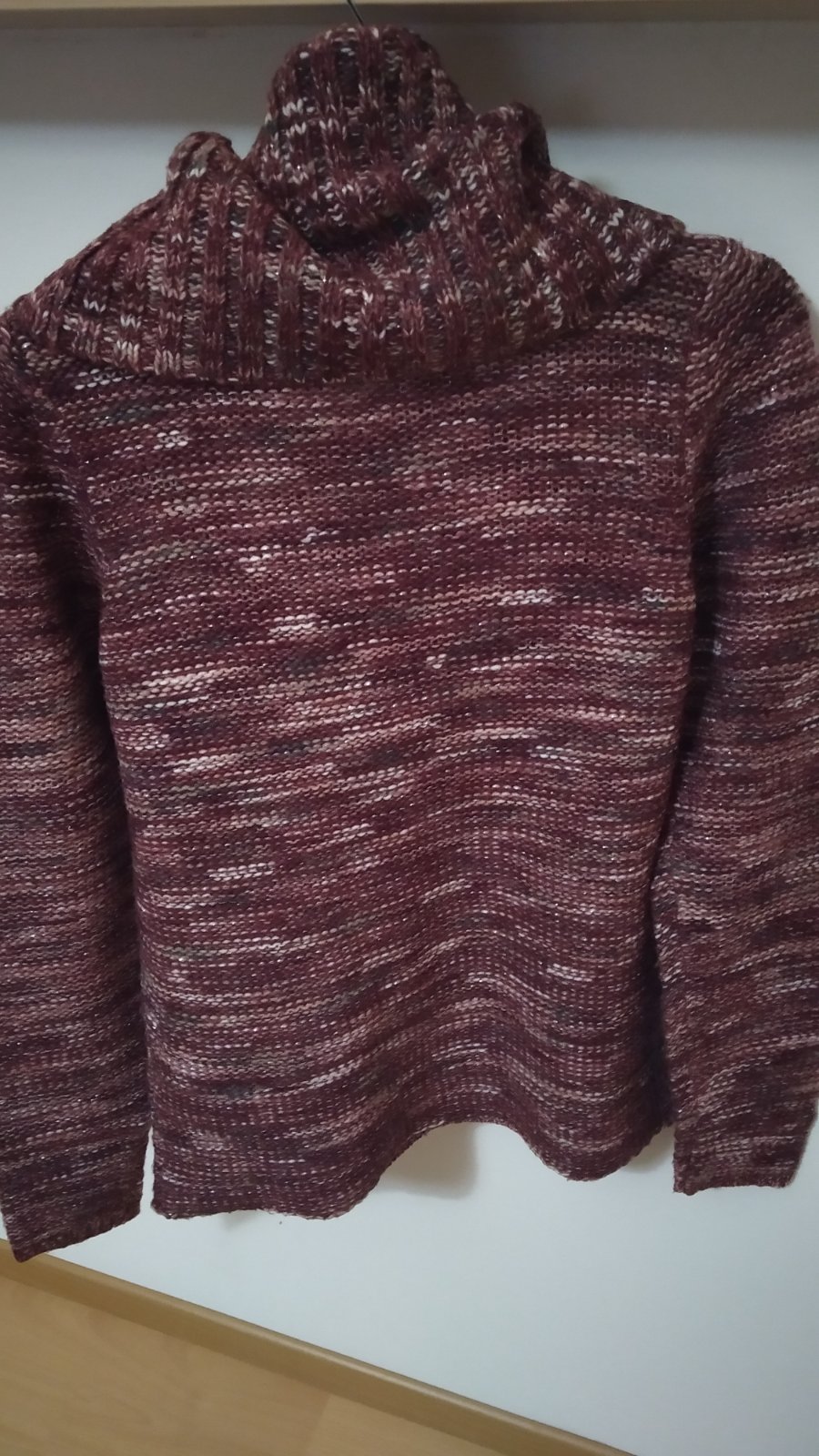 Krásný, s velkým rolákem. Barva vínová s bílou a stříbrnou lurexovou nitkou. Nošený, ale 100% stav. Uvedena vel.XS, ale sedí na S.