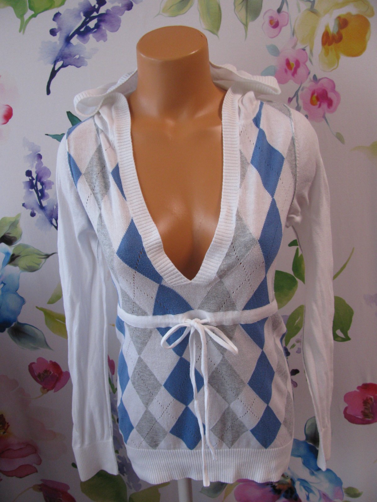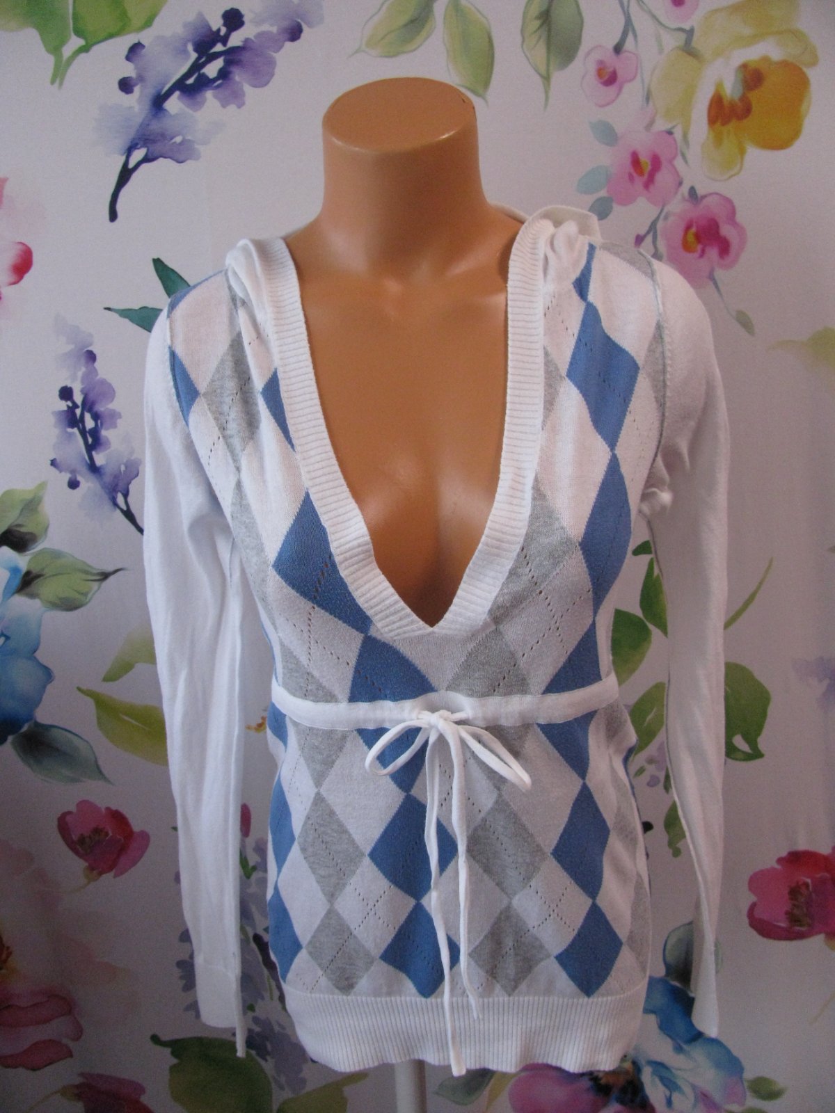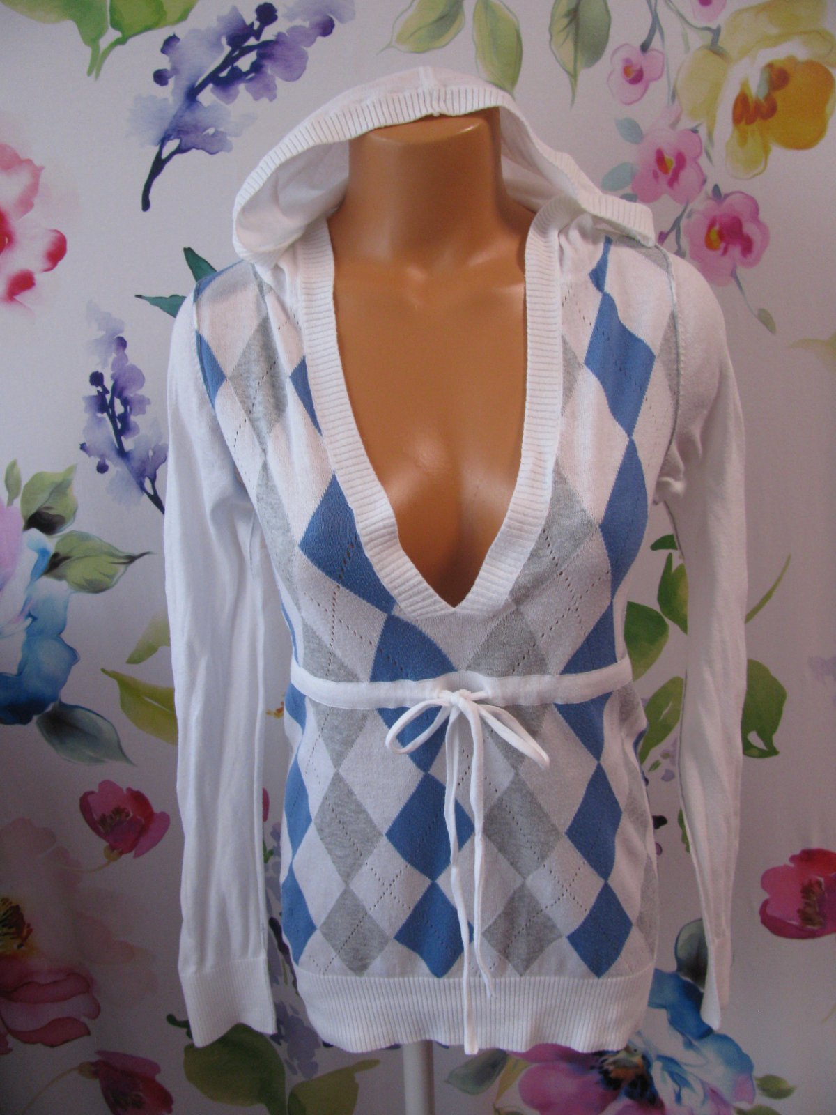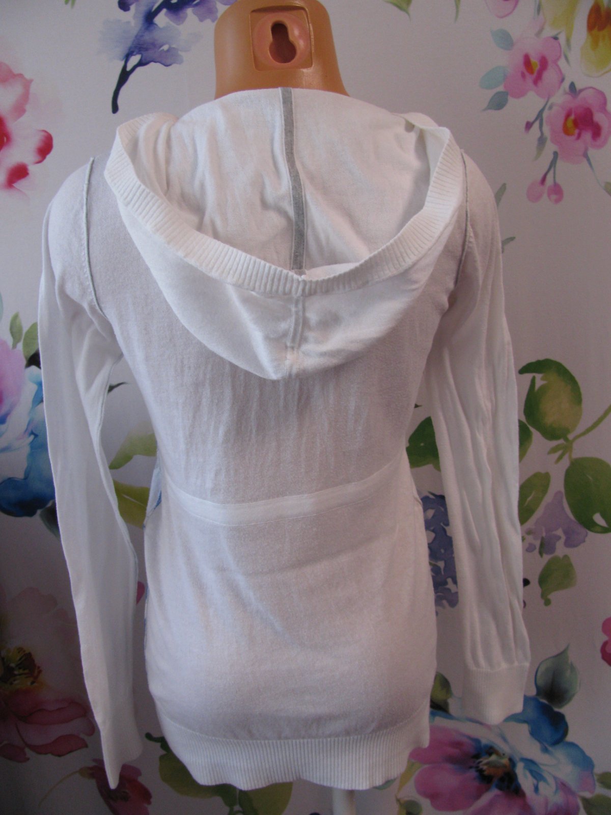 Krásný, bílý svetr s kapucí, s modro šedým vzorem, šňůrka na stažení, logo, krásný stav bez vad, jen velmi lehce chloupek po praní. Štítek stran materiálu ustřižen.