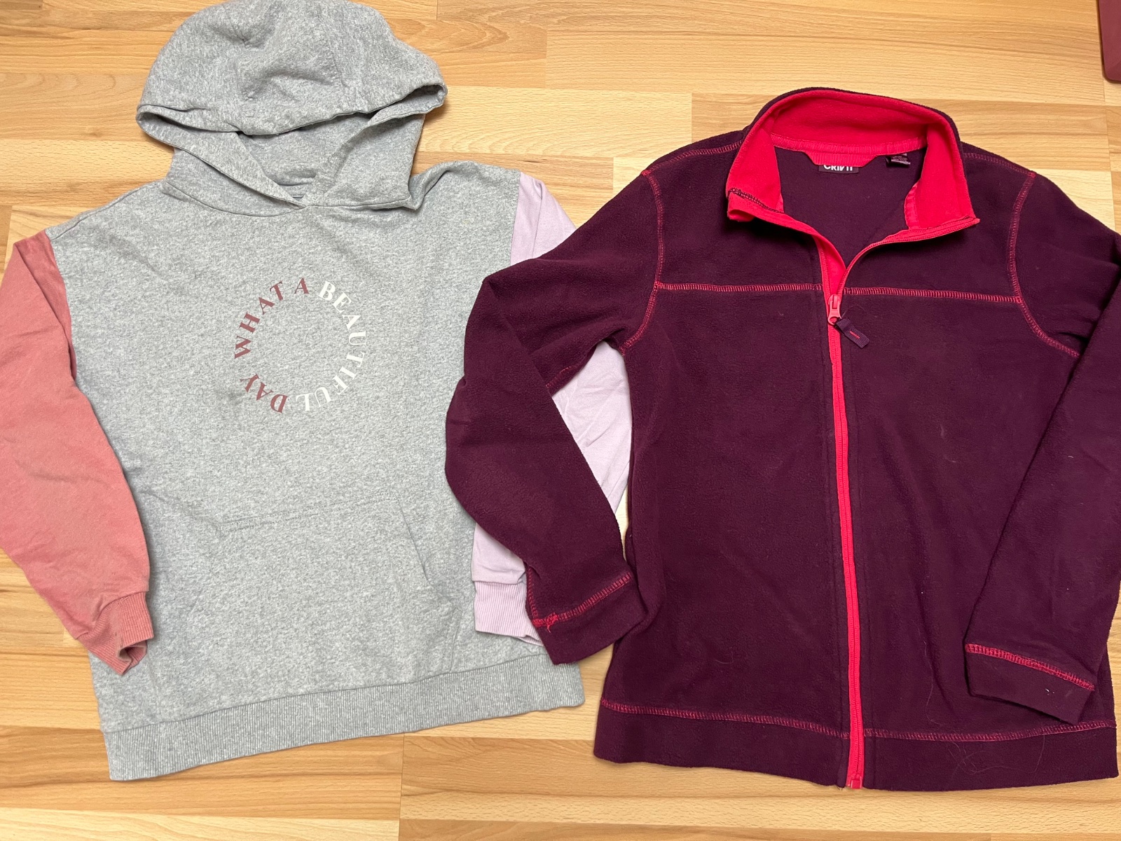 Prodám hezkou mikinu na zapínání. Velikost 146-152. Na zádech malý kaz - nitka, vyfoceno na 4té fotce. Již bylo při koupi. Jinak bez vad, hezké syté barvy.