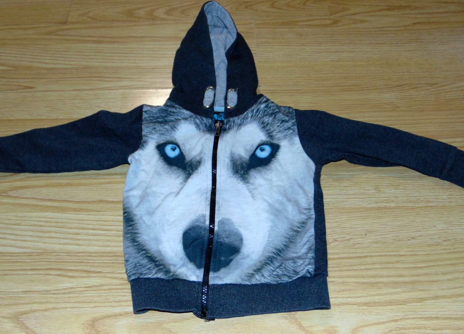 Pěkná, tmavě šedá mikyna přes hlavu, velikost 98-104 (4 roky). Nošená málo, přesto žmolík.