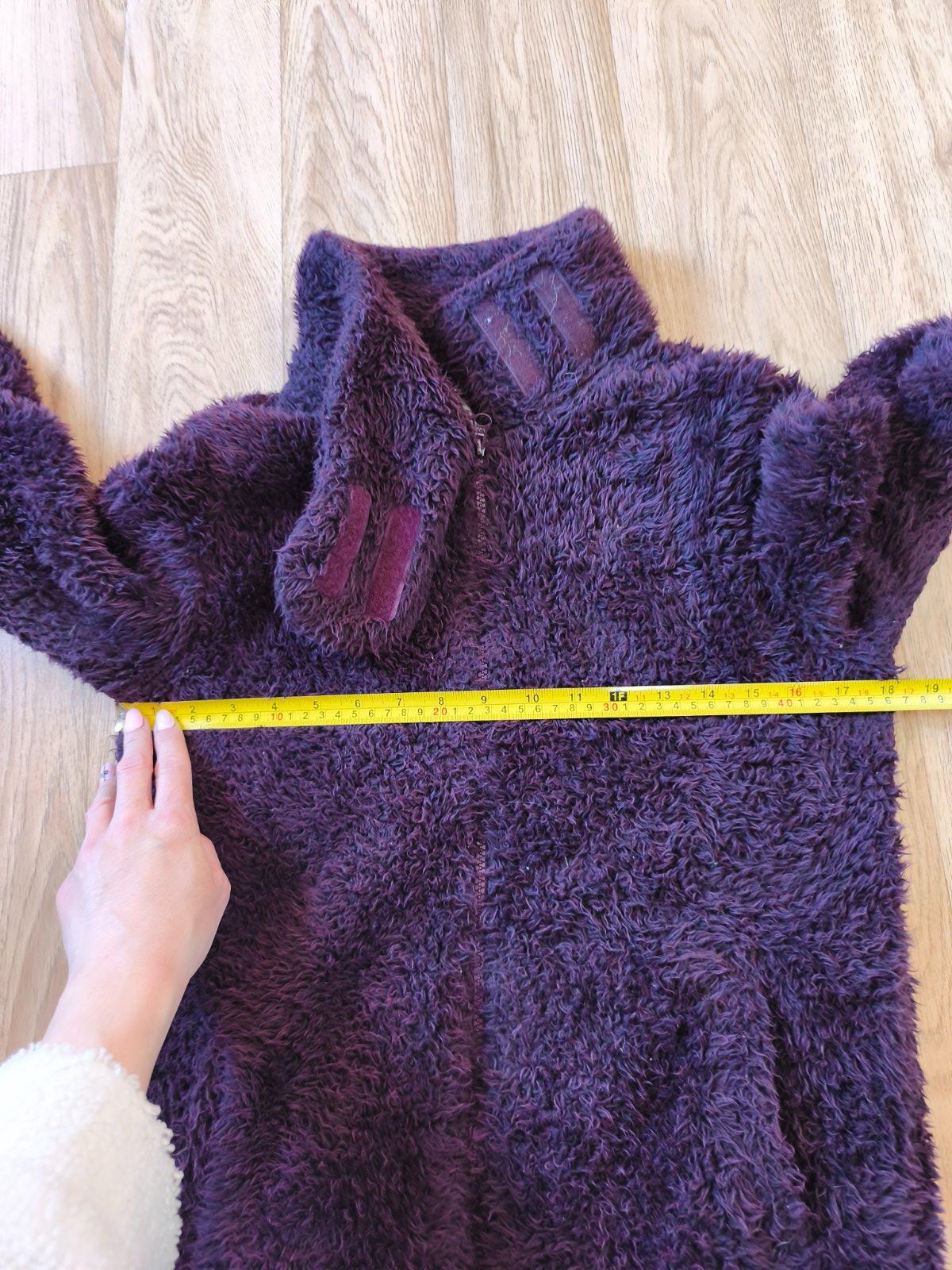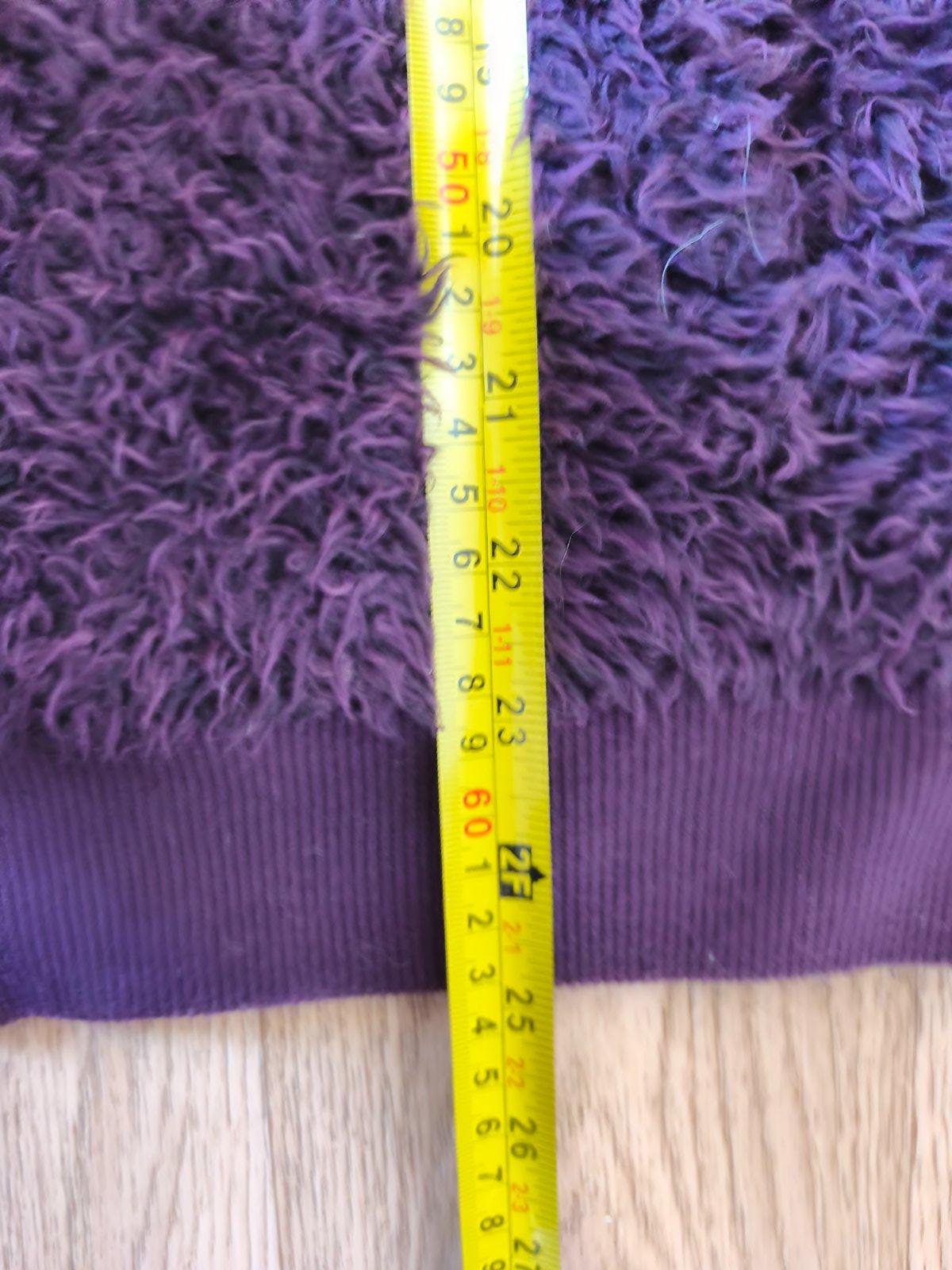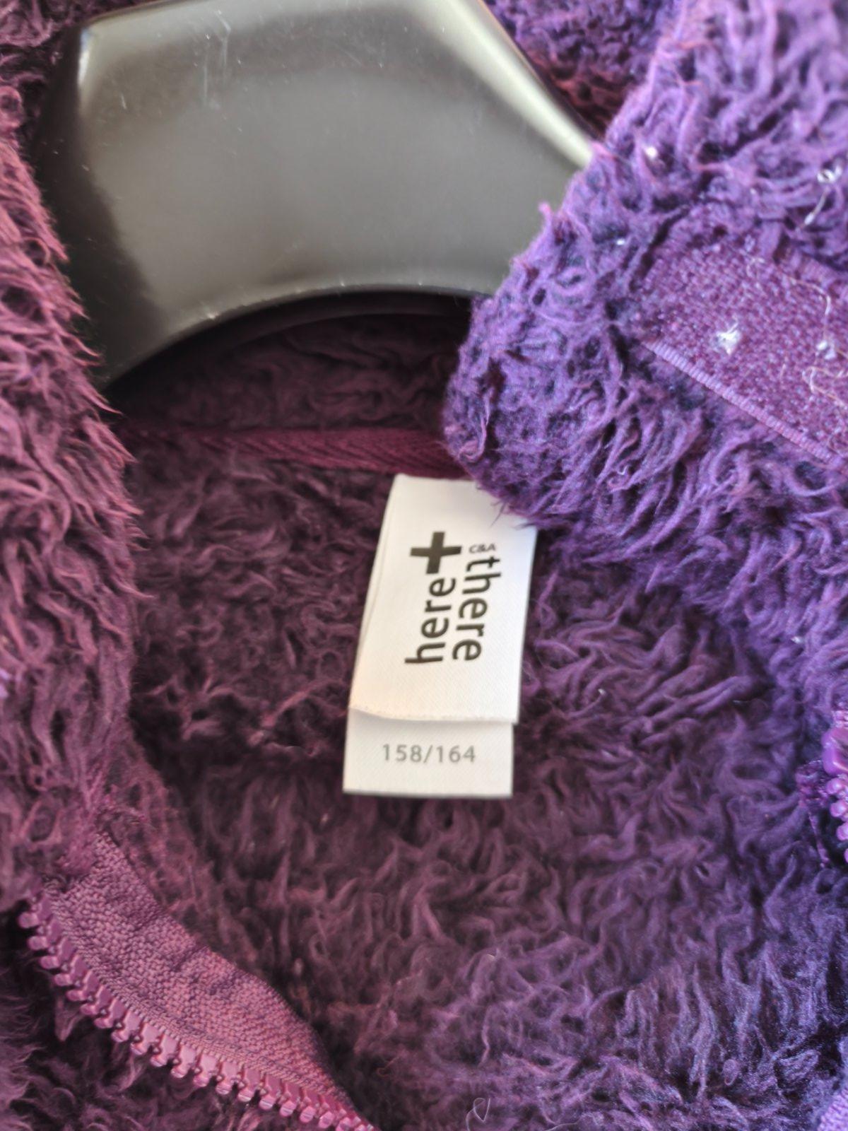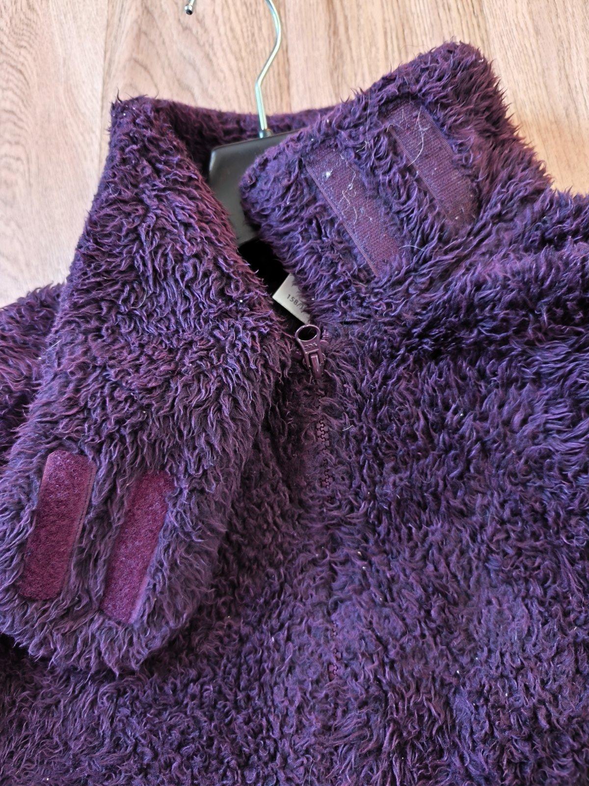 Teplá chlupatá mikina, krásná temně fialová barva, chlup již není jako nový, vzadu hodně slehlý, jinak super, oblečená vypadá fajn. Dívčí 158/164, nošená při XS-M