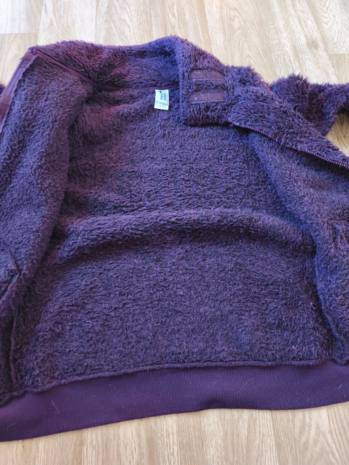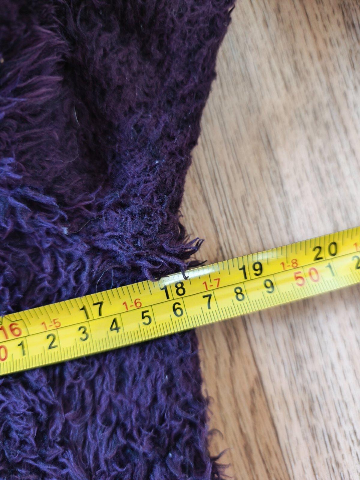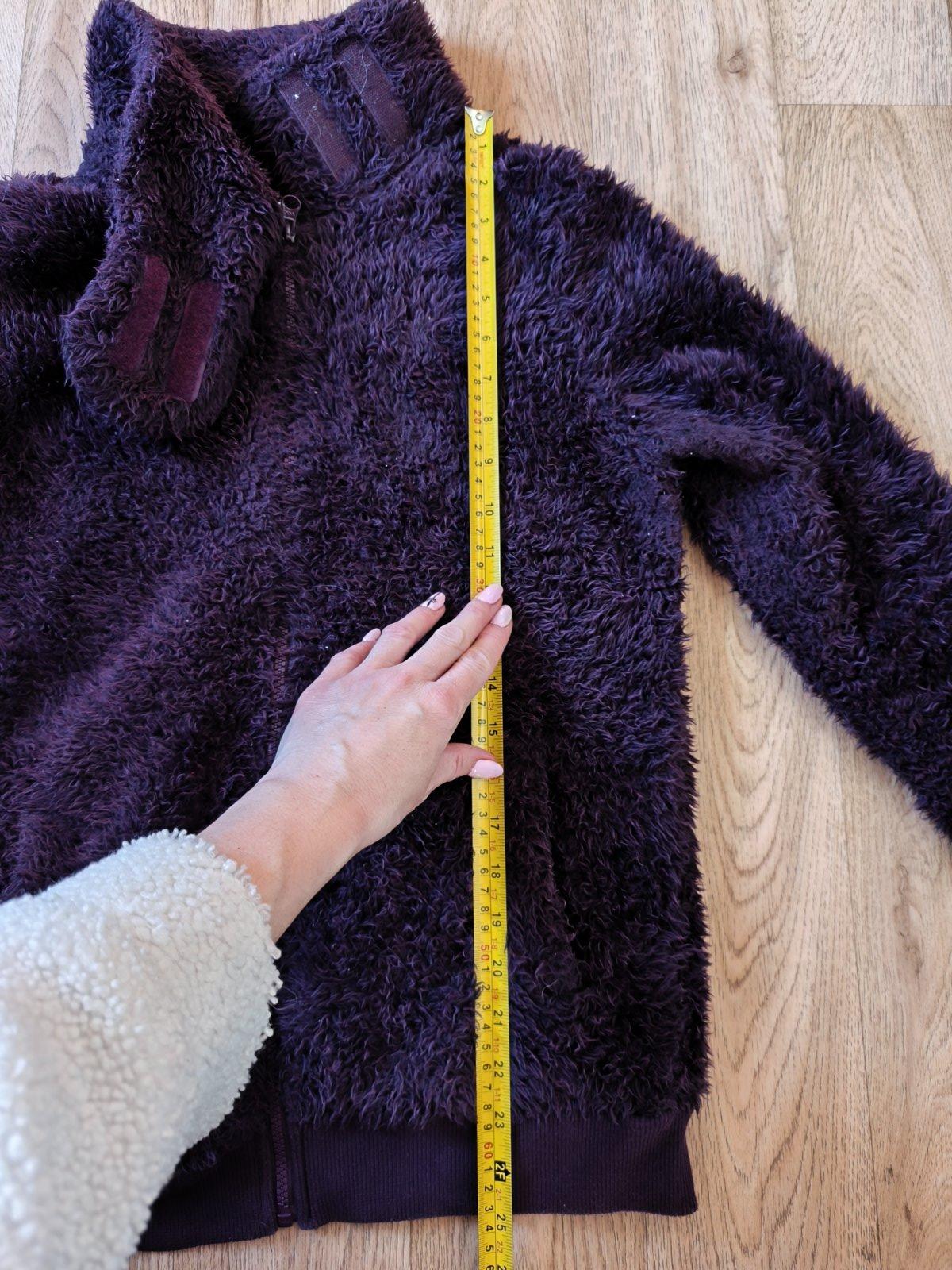 Teplá chlupatá mikina, krásná temně fialová barva, chlup již není jako nový, vzadu hodně slehlý, jinak super, oblečená vypadá fajn. Dívčí 158/164, nošená při XS-M