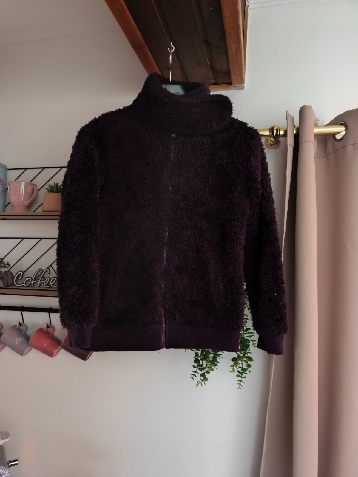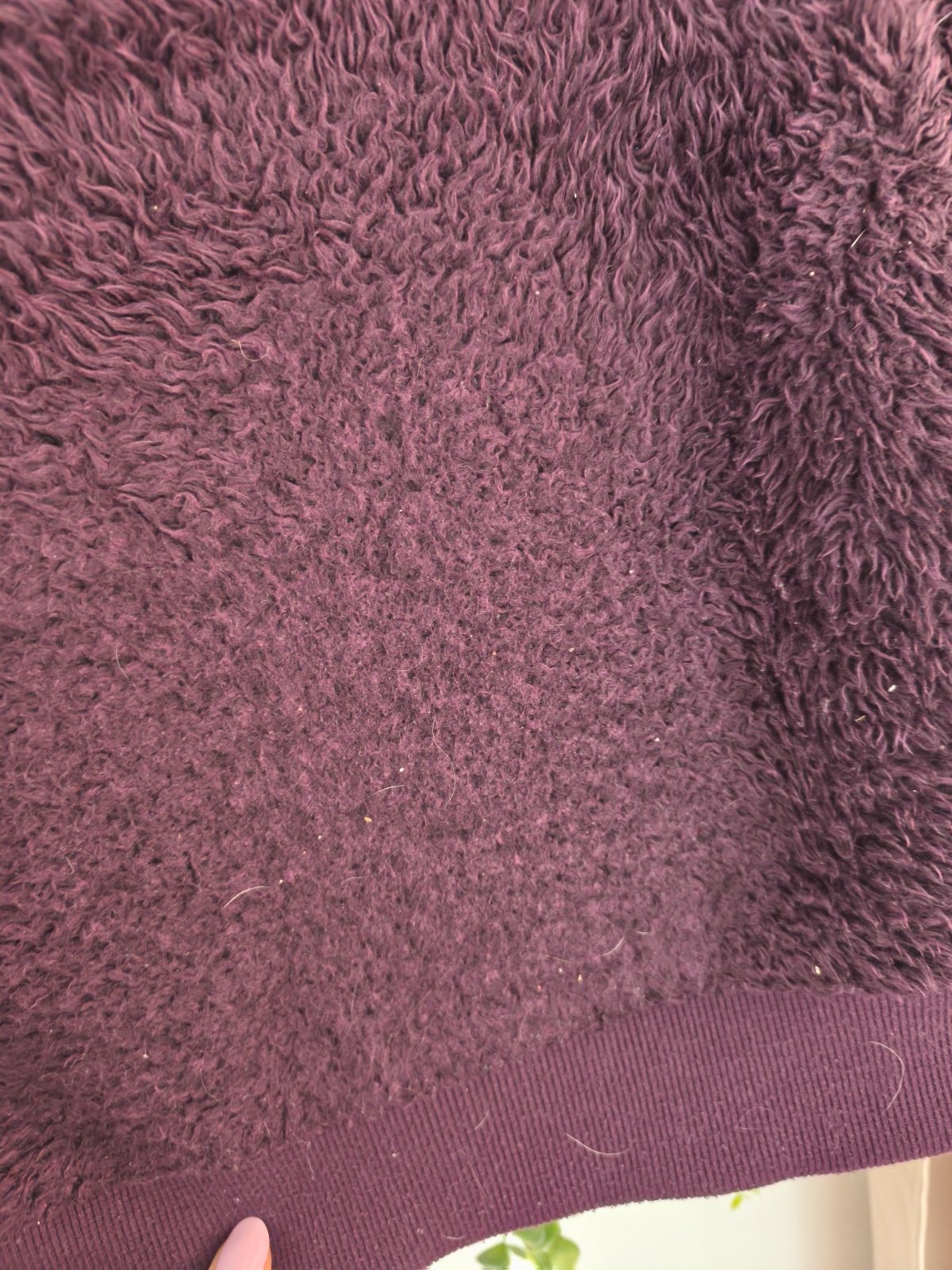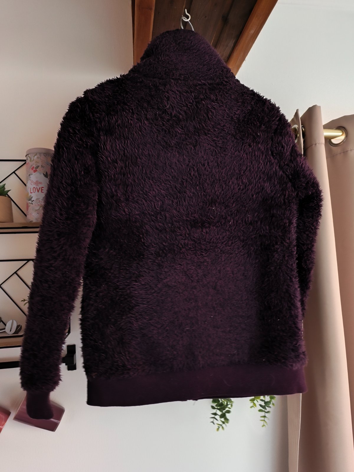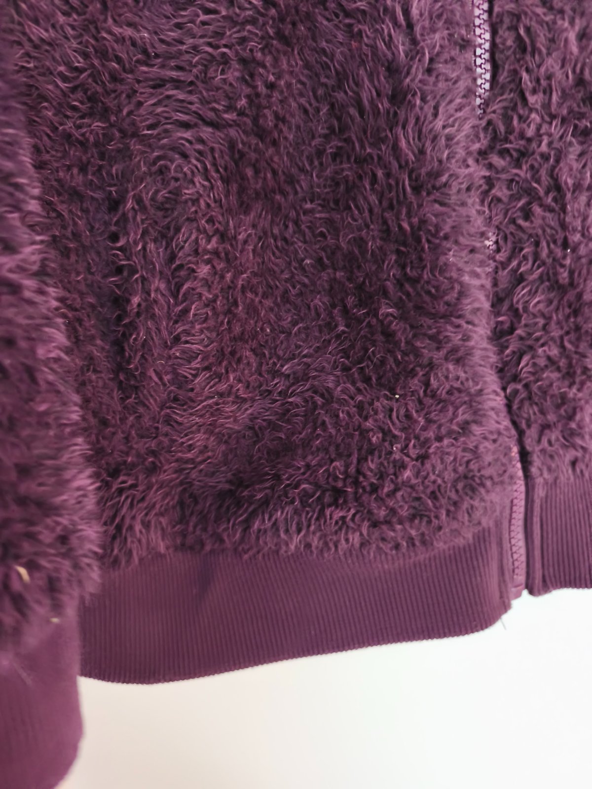 Teplá chlupatá mikina, krásná temně fialová barva, chlup již není jako nový, vzadu hodně slehlý, jinak super, oblečená vypadá fajn. Dívčí 158/164, nošená při XS-M