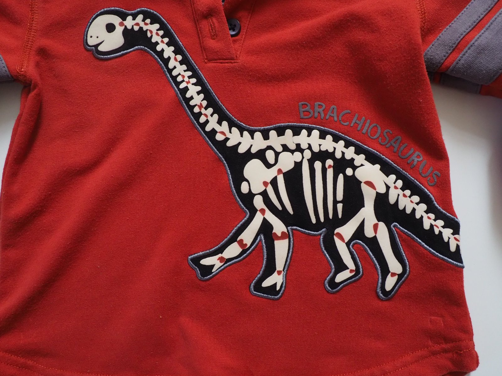 Tepláková mikina s plastickým dinosairem.