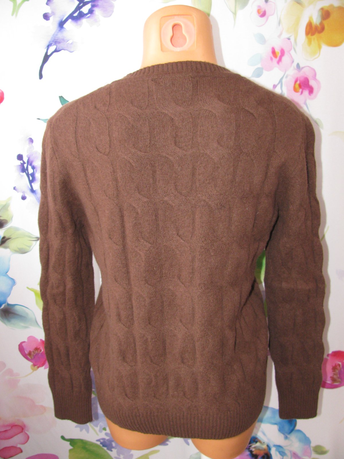 Krásný, velice jemný, čokoládový svetr se vzorem, vyšité logo, Top stav bez vady, velmi málo nošený. Hlavní materiál 100% vlna, stahovák 97% vlna, 3% elastan. PC vysoká.