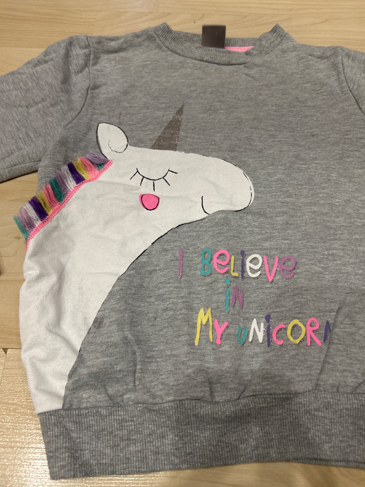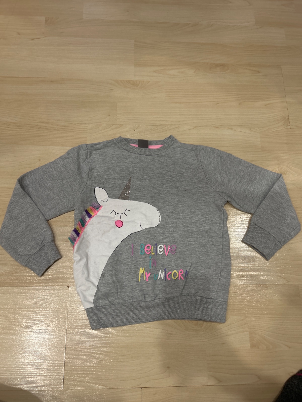 Kupovaná nová, nošená svátečně.Velikost na štítku neodpovídá (122), dávám do menší velikosti, tak jak dcera nosila. Mikina je volnější, širší, délkově na boky. Rozměry d39š36r47/36